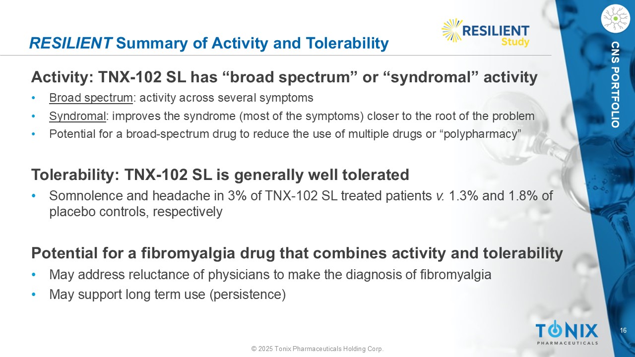 15©2025 Tonix Pharmaceuticals Holding Corp. CNS投资组合弹性耐受性总计*N = 457安慰剂N = 226 TNX-102 SLN = 231系统器官类首选术语系统性不良事件17(3.7%)7(3.1%)10(4.3%)COVID-1910(2.2%)3(1.3%)7(3.0%)嗜睡11(2.4%)4(1.8%)7(3.0%)头痛口腔不良事件56(12.3%)1(0.4%)55(23.8%)感觉不足口腔29(6.3%)2(0.9%)27(11.7%)产品味觉异常18(3.9%)2(0.9%)16(6.9%)感觉异常口腔16(3.5%)0(0.0%)16(6.9%)舌头不适治疗-紧急不良事件(TEAEs)at rate任一治疗组
