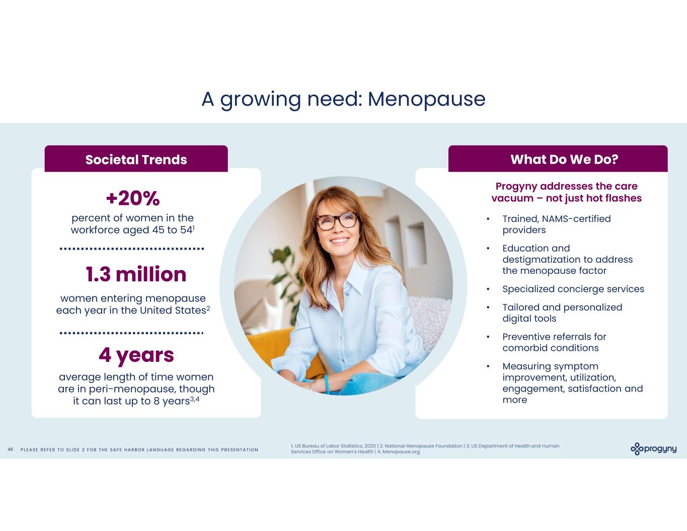 P L E A S E R E F E R T O S L I D E 2 F O R T H E S A F E H A R B O R L A N G U A G E R G A R D I N G T H I S P R E S E N T A T I O N46 A growing needs:更年期我们做什么?社会趋势我们做什么?+ 20%劳动力中45-541岁女性的百分比美国每年进入更年期2130万4年女性处于围绝经期的平均时间,尽管可以持续长达8年3,4 Progyny解决了护理真空——不仅仅是潮热•经过培训、NAMS认证的提供者•教育和消除污名化,以解决更年期因素•专门的礼宾服务•量身定制和个性化的数字工具•针对共病情况的预防性转诊•衡量症状改善、利用率、参与度、满意度等