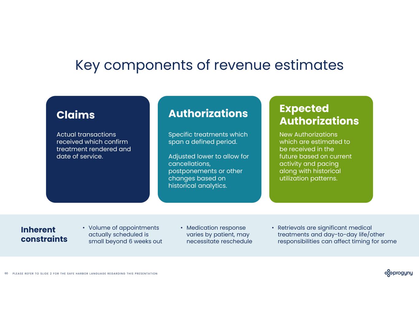 P L E A S E R E E F E R T O S L I D E 2 F O R T H E S A F E H A R B O R L A N G U A G E R G A R D I N G T H I S P R E E N T A T I O N60收入估计的关键组成部分•检索是重要的医疗和日常生活/其他责任可能会影响一些人的时间安排•实际排定的预约量在6周后很小•用药反应因患者而异,可能需要重新安排固有的限制授权跨越规定时期的特定治疗。根据历史分析进行了较低的调整,以允许取消、推迟或其他变化。索赔确认所提供的待遇和送达日期的实际收到的交易。预期授权根据当前活动和节奏以及历史利用模式估计在未来收到的新授权。