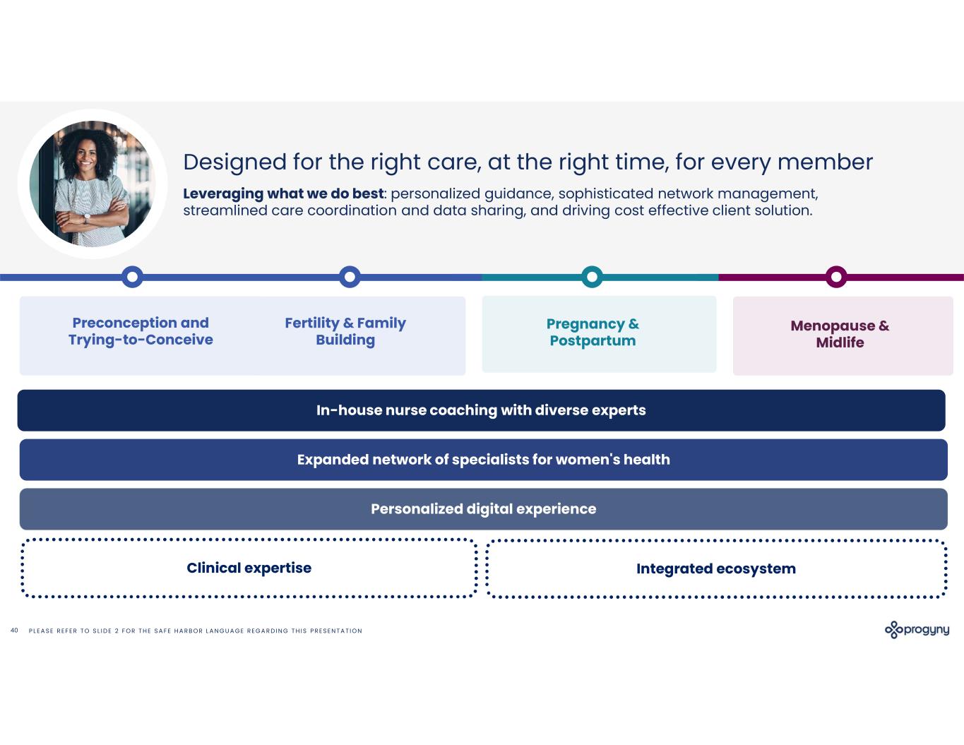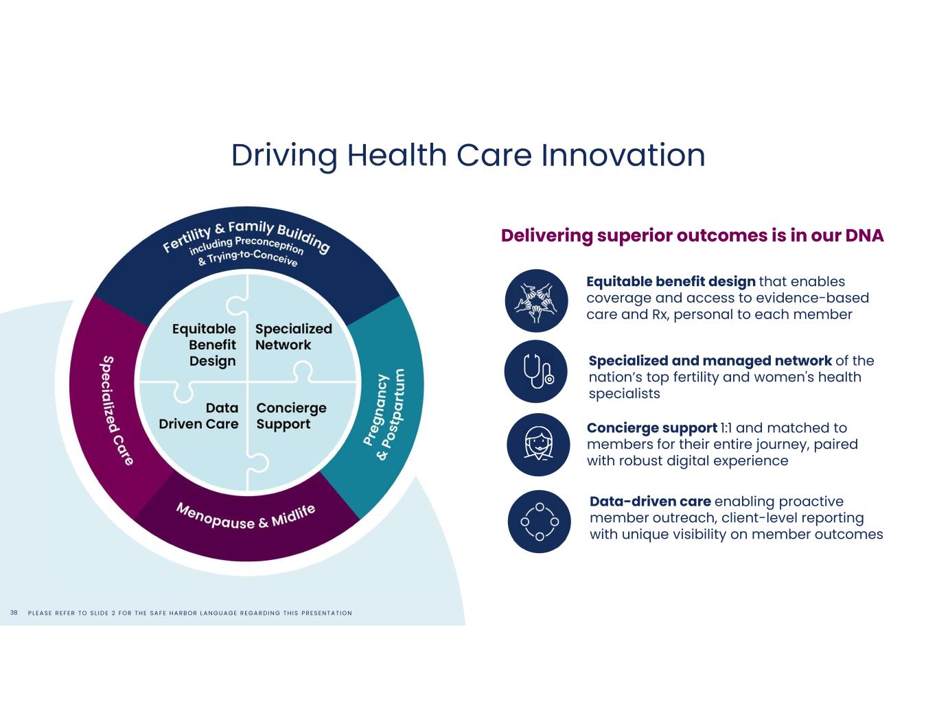 P L E A S E R E F E R T O S L I D E 2 F O R T H E S A F E H A R B O R L A N G U A G E R G A R D I N G T H I S P R E S E N T A T I O N38驾驶健康护理创新礼宾支持1:1并为会员匹配其整个旅程,与强大的数字经验相结合全国顶级生育和妇女健康专家的专业和管理网络公平福利设计,可实现覆盖和获得循证护理和RX,每个成员的个人服务提供卓越的结果是在我们的DNA数据驱动的护理中,能够实现主动的成员外联,客户层面的报告对成员结果具有独特的可见性