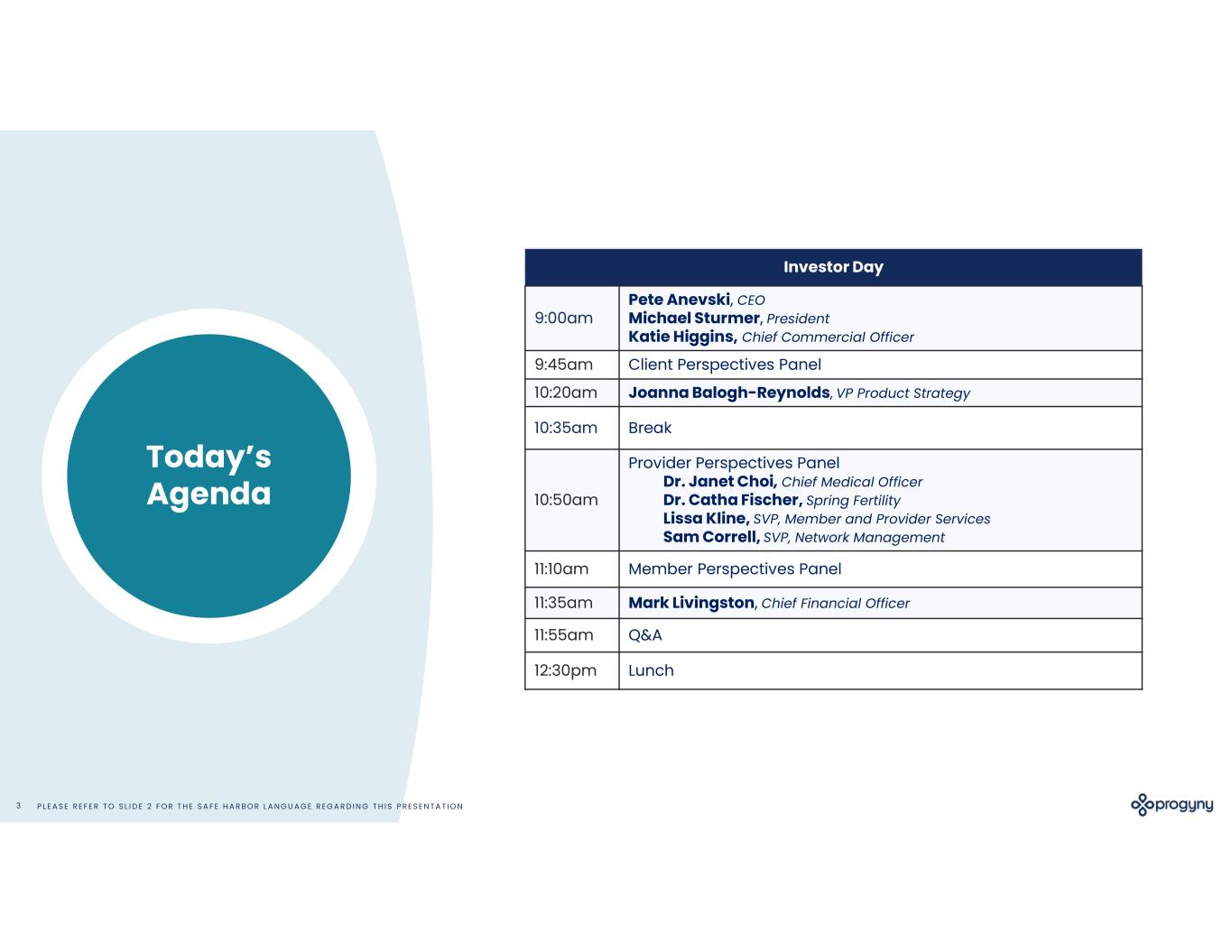 altern today's Agenda Investor Day Pete Anevski,CEO Michael Sturmer,总裁Katie Higgins,首席商务官9:00 am Client Perspectives Panel9:45am Joanna Balogh-Reynolds,产品战略副总裁10:20am Break10:35am Provider Perspectives Panel Janet Choi博士,首席医疗官Catha Fischer博士,Spring Fertility Lissa Kline,高级副总裁,成员和供应商服务Sam Correll,高级副总裁,网络管理人员10:50am Member Perspectives Panel11:10am Mark Livingston,首席财务官11:35am问答11:55am午餐12:30pm PL E A S E R E F E R T O S L I D E 2 F O R T H E A F E H A R B O R L A N G U A G E R G A R D I N G T H I S P R E N T A T I O N3