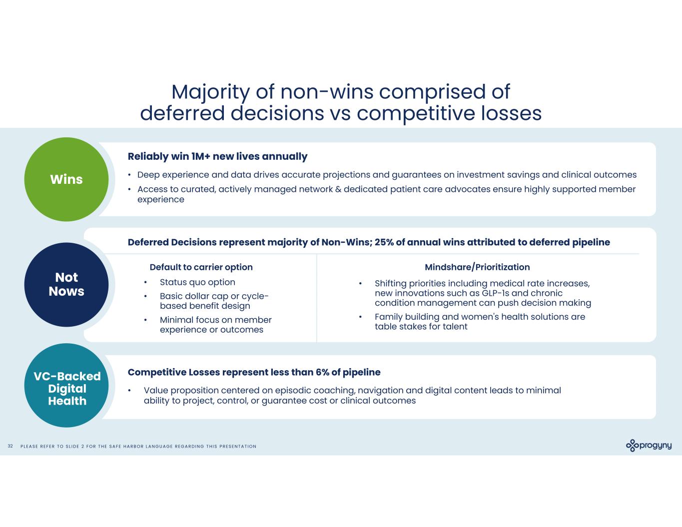 P L E A S E R E F E R T O S L I D E 2 F O R T H E S A F E H A R B O R L A N G U A G E R E G A R D I N G T H I S P R E N T A T I O N32由延期决定与竞争性损失组成的大多数非赢方不是赢方•深厚的经验和数据推动对投资节省的准确预测和保证和临床结果•获得精心策划、主动管理的网络和敬业的患者护理倡导者可确保获得高度支持的会员体验•现状选项•基本的美元上限或基于周期的福利设计•最少关注会员体验或结果•包括提高医疗费率在内的优先事项发生变化,GLP-1和慢性病管理等新创新可以推动决策制定•家庭建设和女性健康解决方案是人才VC支持的桌椅—— Digital Health •以情节辅导、导航和数字内容为中心的价值主张导致最小的投射、控制、或保证成本或临床结果递延决策代表大多数非赢者;25%的年度赢额归因于递延管道可靠地赢得每年100万+的新生命默认运营商选项Mindshare/优先排序竞争性损失代表不到6%的管道