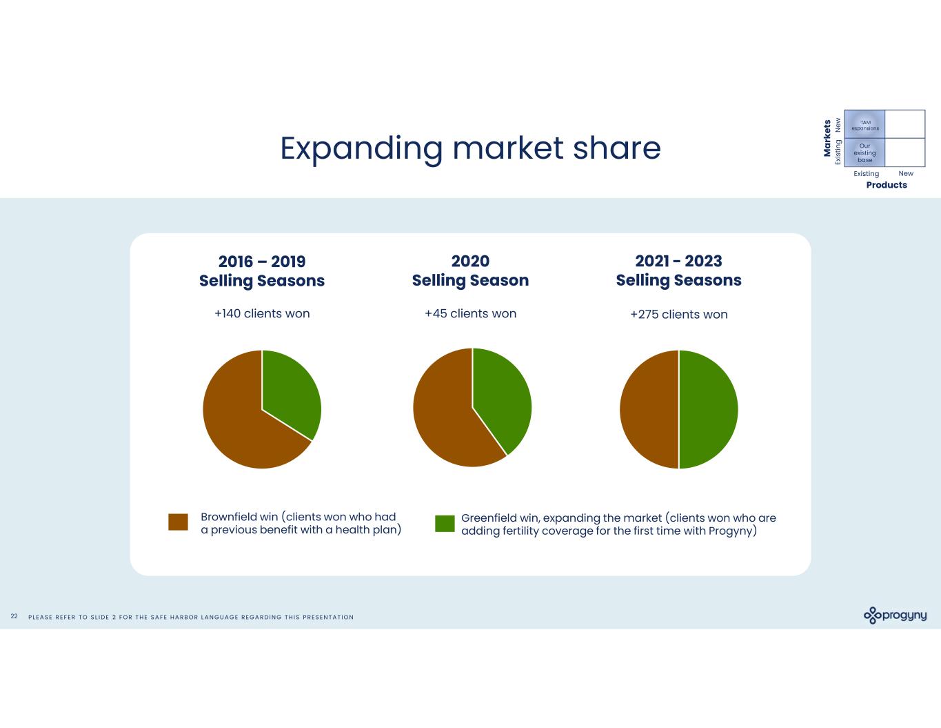 P L E A S E R E F E R T O S L I D E 2 F O R T H E S A F E H A R B O R L A N G U A G E R E G A R D I N G T H I S P R E N T A T I O N21扩展客户关系的途径NewExisting N ew ex is tin g products m ar ke ts Our existing base Upsells our newest services • Progyny RX • adoption和代孕•额外的智能周期•生育力保存•供体组织扩大了生育覆盖面平均每年有20%的Progyny客户以某种方式扩大了他们的受益范围•怀孕和产后•更年期•全球服务•新的客户细分群•通过并购增加钱包新人群的份额