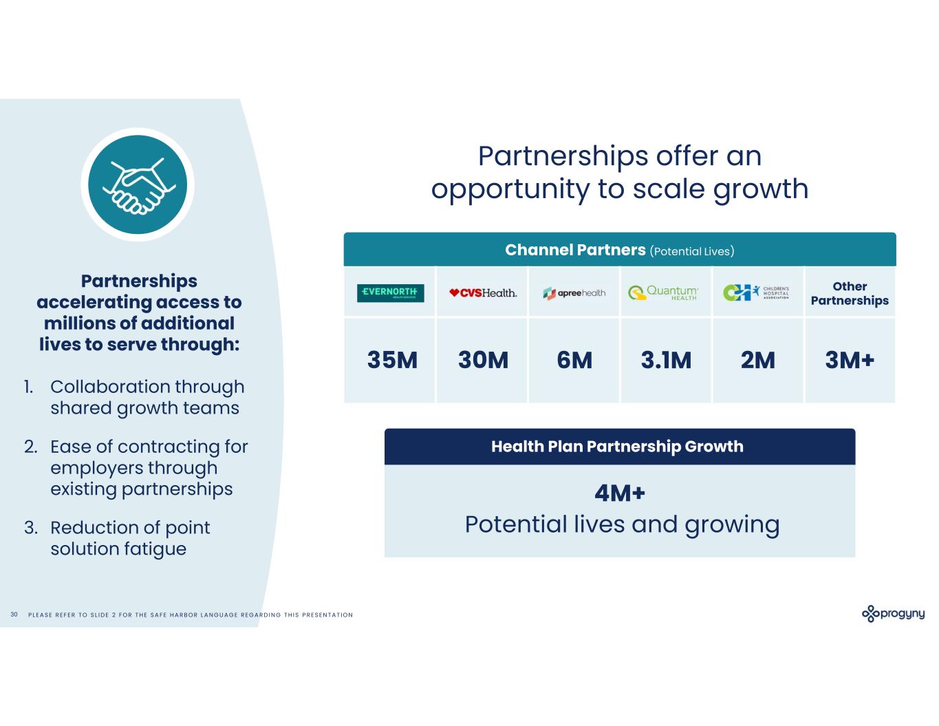 P L E A S E R E E F E R T O S L I D E 2 F O R T H E S A F E H A R B O R L A N G U A G E R E G A R D I N G T H I S P R E S E N T A T I O N30伙伴关系加速获得数百万额外生命,以通过以下方式服务:1。通过共享增长团队进行协作2。通过现有伙伴关系为雇主订约的便利性3。减少点解决方案疲劳伙伴关系提供了一个机会,规模增长30m35m3.1m4m +潜在生命和增长6m2m渠道伙伴(潜在生命)健康计划伙伴关系增长其他伙伴关系3M +