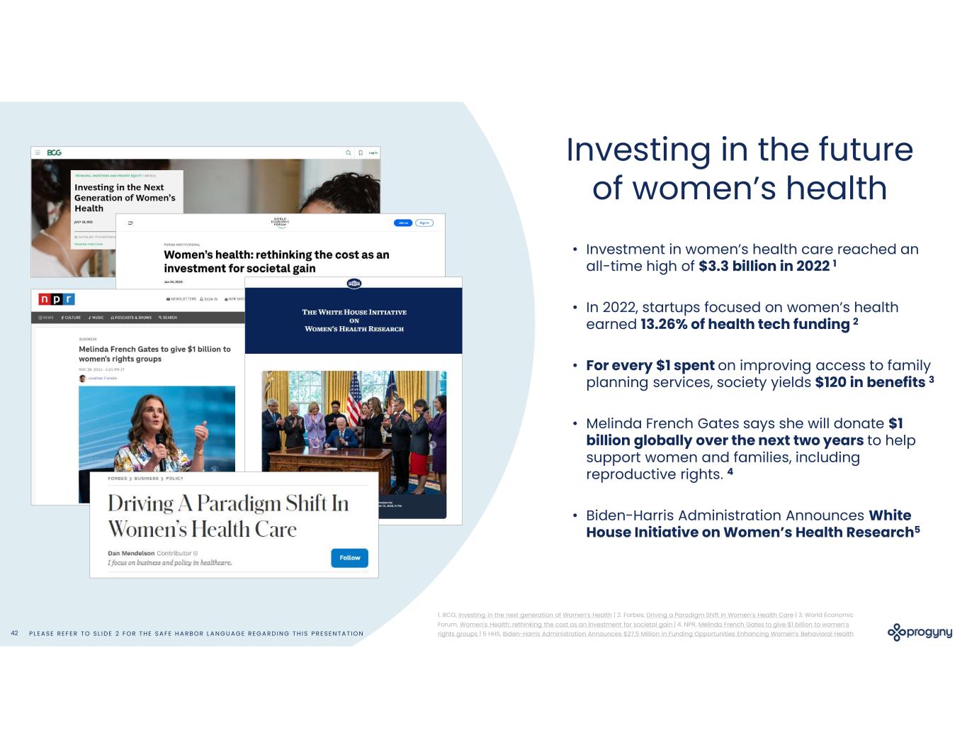 P L E A S E R E F E R T O S L I D E 2 F O R T H E A F E H A R B O R L A N G U A G E R G A R D I N G T H I S P R E S E N T A T I O N42投资于女性健康的未来• 2022年对女性医疗保健的投资达到历史最高的33亿美元1 • 2022年,专注于女性健康的初创公司获得了13.26%的健康科技资金2 •在改善获得计划生育服务方面每花费1美元,社会就会产生120美元的福利3 •梅琳达·法兰西·盖茨表示,她将在未来两年内在全球范围内捐赠10亿美元,以帮助支持妇女和家庭,包括生殖权利。4 •拜登-哈里斯政府宣布白宫关于妇女健康研究的倡议51。BCG,投资下一代女性健康| 2。福布斯,推动女性医疗保健的范式转变| 3。世界经济论坛丨妇女健康:重新思考将成本作为社会收益的投资| 4。NPR丨梅琳达-法国·盖茨将向妇女权利组织捐赠10亿美元| 5 HHS,拜登-哈里斯政府宣布提供2750万美元的资金机会,以加强妇女的行为健康