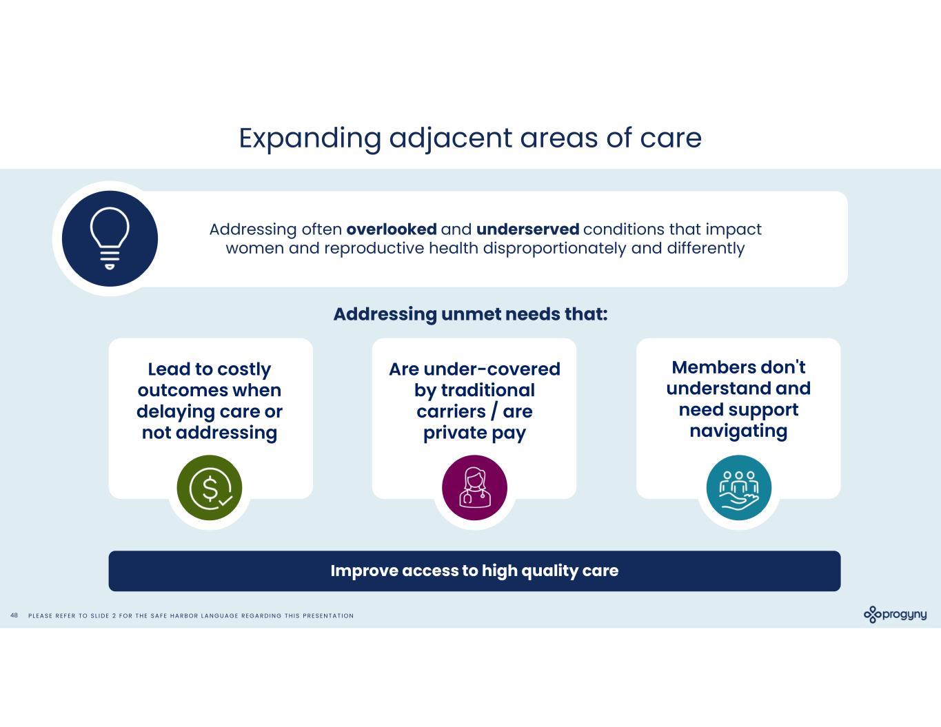 P L E A S E R E F E R T O S L I D E 2 F O R T H E S A F E H A R B O R L A N G U A G E R E G A R D I N G T H I S P R E S E N T A T I O N47 Women and Health a specialized benefit platform,created to accelerate interventions to treating relevant health issues,which are differently diagnosed or treated in women。PROGYNY生育和家庭建设护理专业条件辅助服务盆底心理健康泌乳和牛奶运输育儿和照顾者支持社会决定因素营养和生活方式月经妊娠PCOS子宫内膜异位症自身免疫性心脏糖尿病先兆子痫和高血压更年期乳腺癌和妇科癌甲状腺孕前辅助生育收养代孕和产后重返工作岗位患者教育男性不孕不育生育药物基因检测体重管理护理导航和获得护理的机会性健康初级/健康妇女护理LGBTQIA +特定压力和情感支持