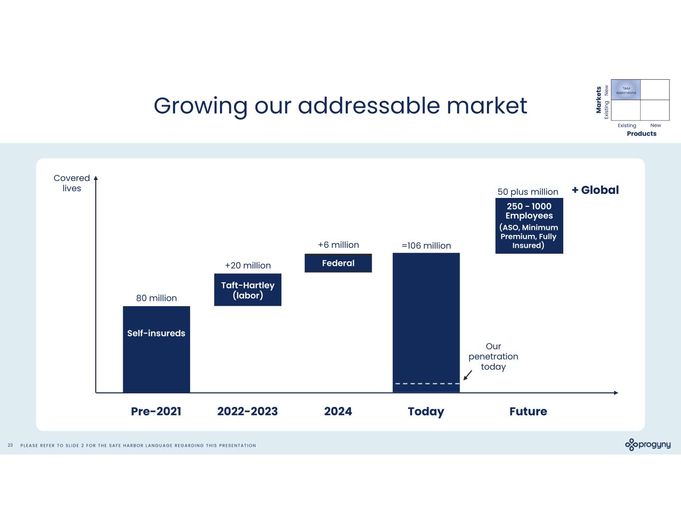 P L E A S E R E F E R T O S L I D E 2 F O R T H E S A F E H A R B O R L A N G U A G E R E G A R D I N G T H I S P R E N T A T I O N23增长我们的潜在市场Pre-2021 2022-2023 2024 Future covered lives 80 million self-insured Taft-Hartley(labor)+ 20 million Federal + 600 million 50 plus million today = 1.06亿our penetration today + Global 250-1000名员工TAM扩充新的现有产品M ar ke ts N ew ex is tin g(ASO,最低保费,全额保险)