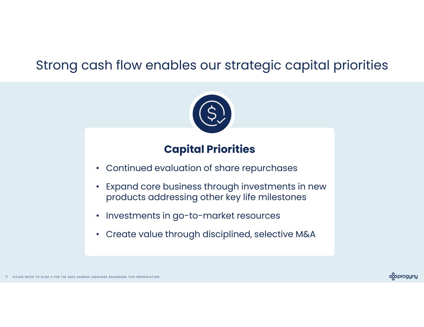 P L E A S E R E F E R T O S L I D E 2 F O R T H E S A F E H A R B O R L A N G U A G E R E A R D I N G T H I S P R E S E N T A T I O N71强劲的现金流使我们的战略资本优先事项成为可能•持续评估股份回购•通过投资新产品来扩展核心业务,以解决其他关键生命里程碑•投资上市资源•通过有纪律、有选择的并购资本优先事项创造价值