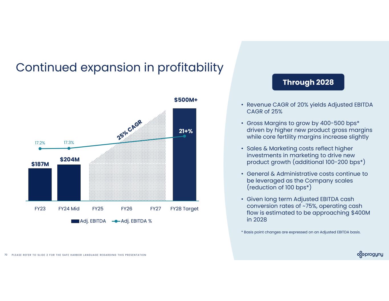 P L E A S E R E F E R T O S L I D E 2 F O R T H E A F E H A R B O R L A N G U A G E R E G A R D I N G T H I S P R E N T A T I O N70 17.2% 17.3% 0.0% 5.0% 10.0% 15.0% 20.0% 25.0% 30.0% 35.0% 40.0% $-$ 100 $ 200 $ 300 $ 400 $ 500 $ 600 $ 700 FY23 FY24 Mid FY25 FY26 FY27 FY28 Target Adj. EBITDA Adj. EBITDA %盈利能力持续扩张5亿美元+ •收入复合年增长率为20%收益率调整后EBITDA复合年增长率为25% •毛利率将增长400-500个基点*,这是由于新产品毛利率提高,而核心生育率利润率略有提高•销售和营销成本反映了为推动新产品增长而对营销进行的更高投资(额外100-200个基点*)•随着公司规模扩大,一般和行政成本继续发挥杠杆作用(减少100个基点*)•鉴于长期调整后EBITDA现金转换率约为75%,经营现金流预计将在2028年接近4亿美元21 + % 1.87亿美元到2028年将达到2.04亿美元*基点变化以调整后EBITDA为基础表示。