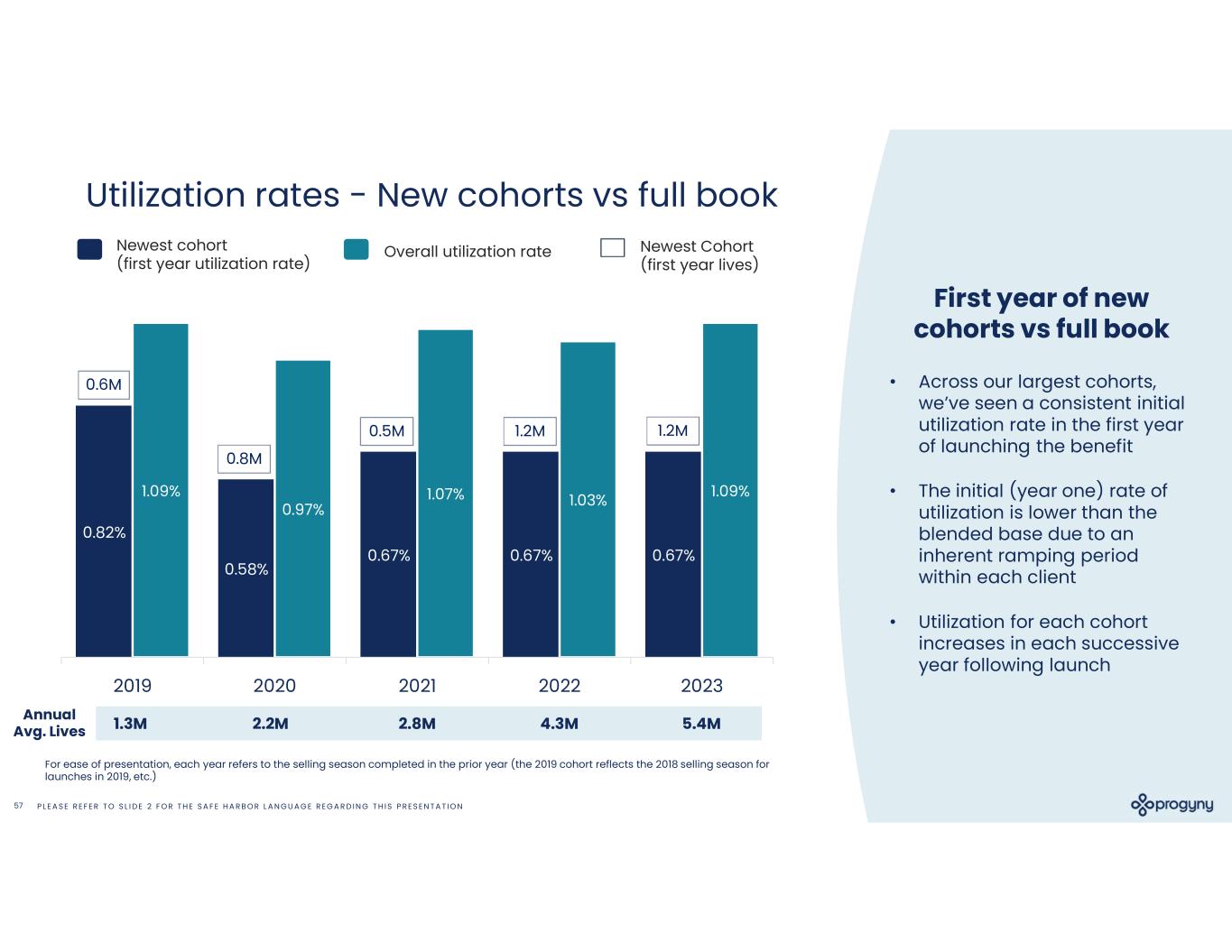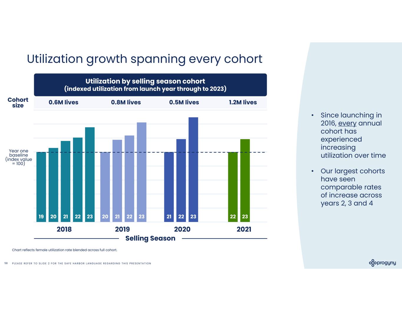 P L E A S E R E F E R T O S L I D E 2 F O R T H E S A F E H A R B O R L A N G U A G E R E G A R D I N G T H I S P R E N T A T I O N58 1920212220212223212223222323跨越每个队列图表的利用率增长反映了整个队列中混合的女性利用率。第一年基线(指数值= 100)队列规模120万生命0.5M生命0.8M生命0.6M生命按销售季节队列划分的利用率(从启动年份到2023年的指数化利用率)•自2016年启动以来,随着时间的推移,每个年度队列的利用率都在增加•我们最大的队列在第2年、第3年和第4年销售季节2021202020192018期间出现了可比的增长率