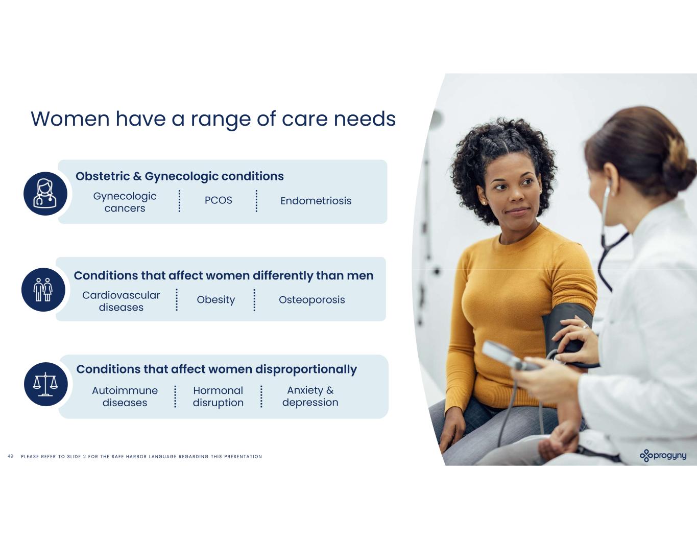 P L E A S E R E F E R T O S L I D E 2 F O R T H E S A F E H A R B O R L A N G U A G E R G A R D I N G T H I S P R E S E N T A T I O N49女性有一系列护理需求妇产科状况PCOS状况对女性的影响不同于男性心血管疾病骨质疏松肥胖状况影响女性不成比例的焦虑&抑郁荷尔蒙紊乱自身免疫性疾病妇科癌症子宫内膜异位症