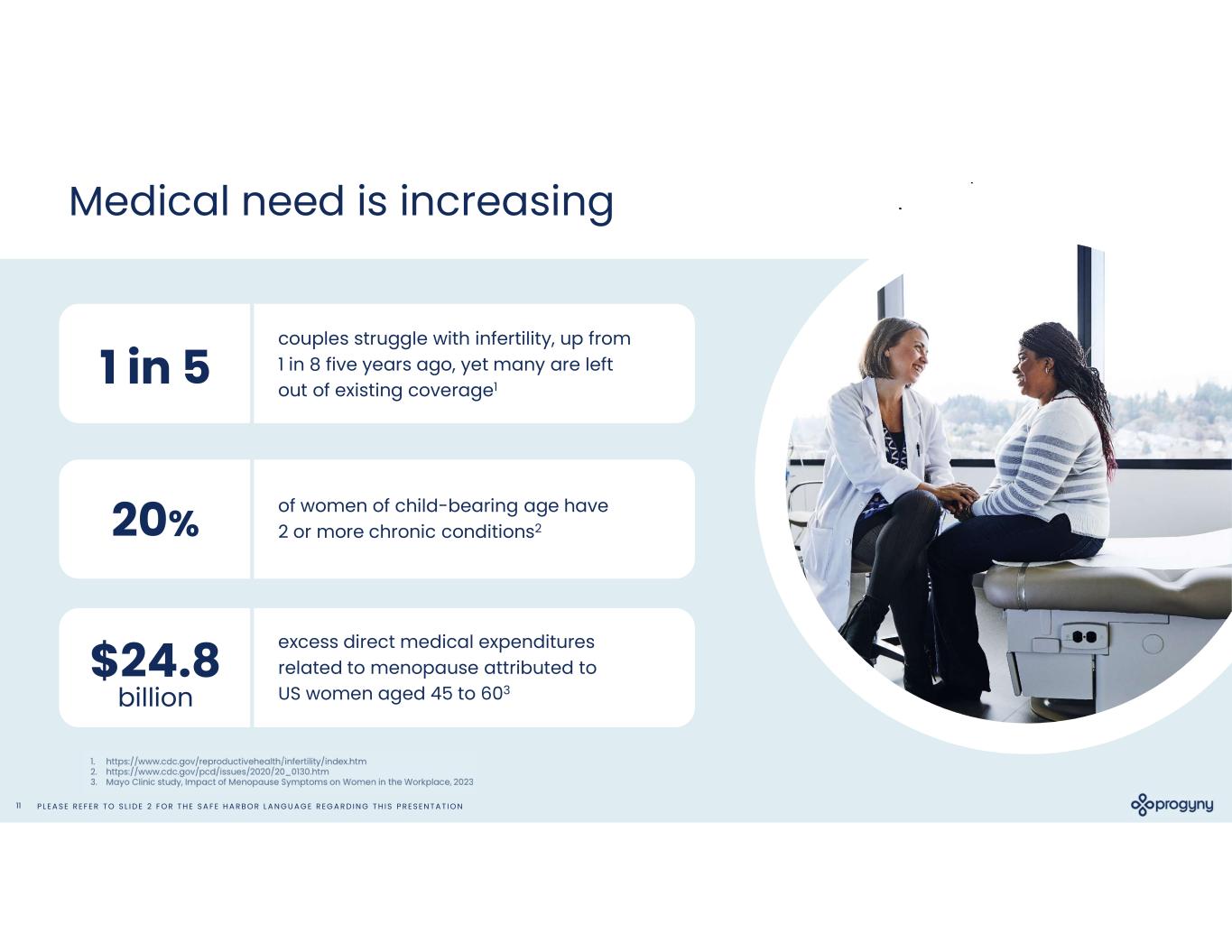 P L E A S E R E F E R T O S L I D E 2 F O R T H E S A F E H A R B O R L A N G U A G E R G A R D I N G T H I S P R E S E N T A T I O N11夫妇与不孕症作斗争,而五年前这一比例为8:1,然而,许多人被排除在现有覆盖范围之外1医疗需求正在增加每5个育龄妇女中就有1个有2个或更多的慢性病220%与更年期相关的超额直接医疗支出归因于45至603岁的美国女性248亿美元