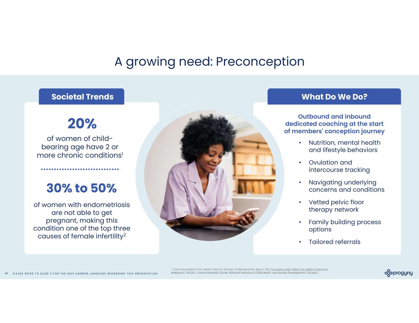 P L E A S E R E F E R T O S L I D E 2 F O R T H E S A F E H A R B O R L A N G U A G E R E G A R D I N G T H I S P R E S E N T A T I O N43 A growing needs:preconception society trends of育龄妇女有2个或更多的慢性病1 20% 1。联邦基金,生育年龄妇女保健| 2。美国国立卫生研究院,骨盆疼痛会影响我怀孕的能力吗?| NICHD-Eunice Kennedy Shriver National Institute of Child Health and Human Development(nih.gov)患有子宫内膜异位症的女性无法怀孕,使这种情况成为女性不孕的三大原因之一2 30%到50%我们该怎么做?成员受孕之旅开始时的出站和入站专门辅导•营养、心理健康和生活方式行为•排卵和性交追踪•导航潜在的担忧和状况•经过审查的盆底治疗网络•家庭建设过程选项•量身定制的转诊