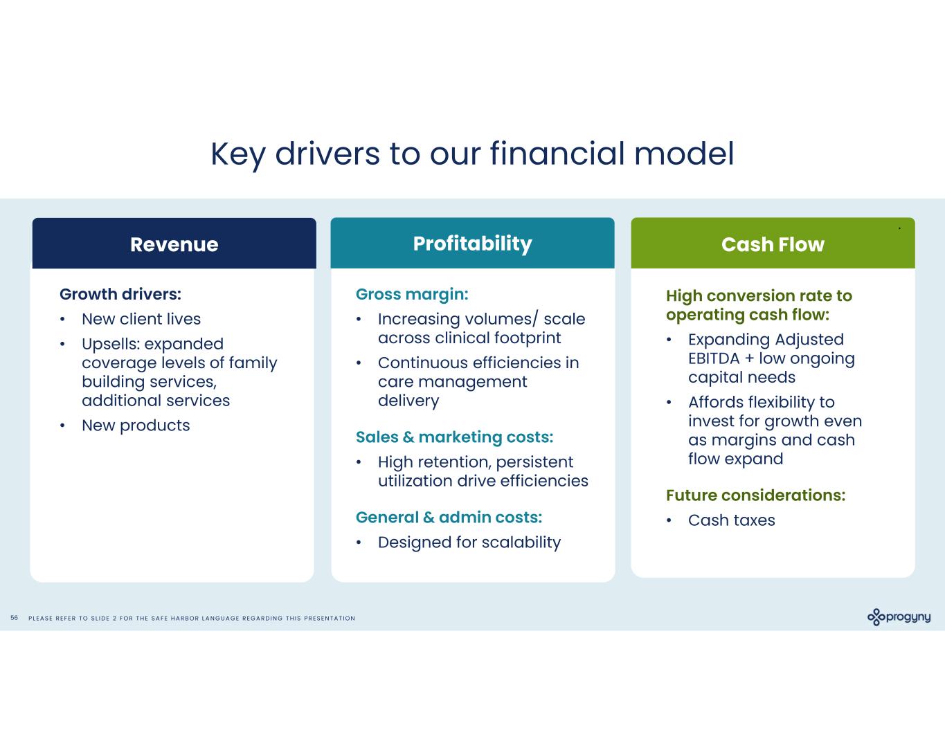 P L E A S E R E F E R T O S L I D E 2 F O R T H E S A F E H A R B O R L A N G U A G E R G A R D I N G T H I S P R E S E N T A T I O N56我们财务模型的关键驱动因素收入盈利能力高转换为经营现金流:•扩大调整后EBITDA +低持续资本需求•提供投资的灵活性在利润率和现金流扩大的情况下实现增长未来考虑因素:•现金税现金流毛利率:•增加整个临床足迹的数量/规模•护理管理交付的持续效率销售和营销成本:•高保留率、持续利用率推动效率一般和管理成本:•专为可扩展性增长驱动因素而设计:•新客户生活•追加销售:扩大家庭建设服务的覆盖水平,附加服务•新产品