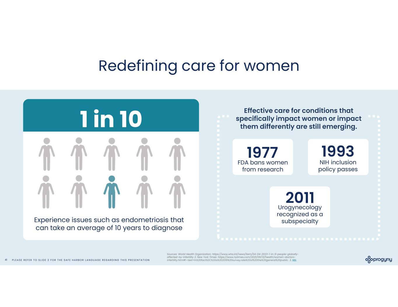 P L E A S E R E F E R T O S L I D E 2 F O R T H E S A F E H A R B O R L A N G U A G E R E A R D I N G T H I S P R E S E N T A T I O N41 1 in 10 experience issues such as endometriosis平均可能需要10年才能诊断1993年美国国立卫生研究院纳入政策通过1977年FDA禁止女性参与研究来源:世界卫生组织;https://www.who.int/news/item/04-04-2023-1-in-6-people-globally-affected-by-unertility 2。纽约时报:https://www.nytimes.com/2021/09/13/health/women-doctors-infertility.html#:~:text = in % 20fact % 2C % 20a % 202016% 20survey,rate % 20of % 20the % 20general % 20public。3.NSI,重新定义对女性的护理2011被公认为亚专科的泌尿妇科针对具体影响女性或以不同方式影响她们的情况的有效护理仍在不断涌现。