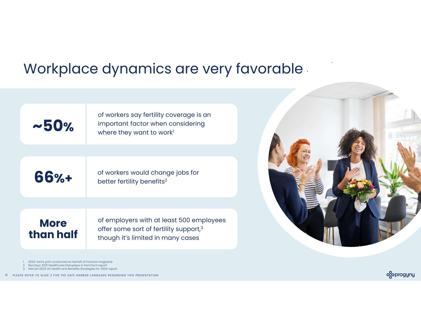 工人的PL E A S E R E F E R T O S L I D E 2 F O R T H E S A F E H A R B O R L A N G U A G E R G A R D I N G T H I S P R E S E N T A T I O N12表示,在考虑他们想在哪里工作时,生育覆盖率是一个重要因素1工作场所动态非常有利~50%的工人会跳槽为了获得更好的生育福利266% +至少有500名员工的雇主提供某种生育支持,3尽管在许多情况下是有限的超过一半