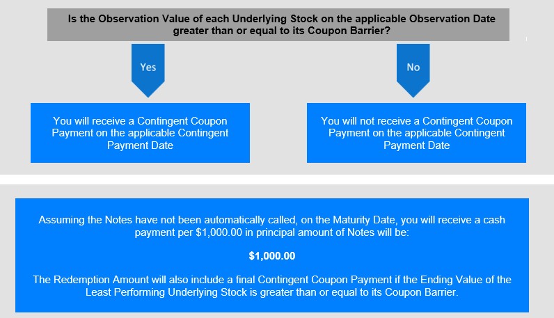 如果,在任何月度观察日,观察值为每个基础股票大于或等于其票息障碍,我们将在适用的或有支付日(包括到期日)支付每1,000.00美元本金金额的票据6.667美元的或有票息支付(相当于每月0.6667%或每年8.00%的利率)。