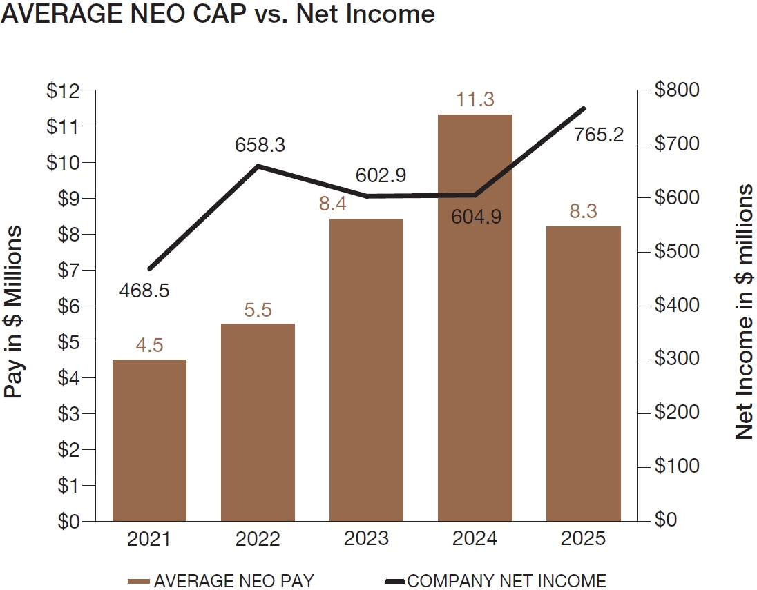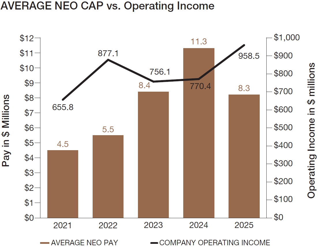 下图显示了2021-2025年我们CEO和其他NEO的“实际支付薪酬”(CAP)与(i)公司和道琼斯美国建筑材料和固定装置指数的TSR、(ii)公司的净收入和(iii)公司的营业收入之间的关系。