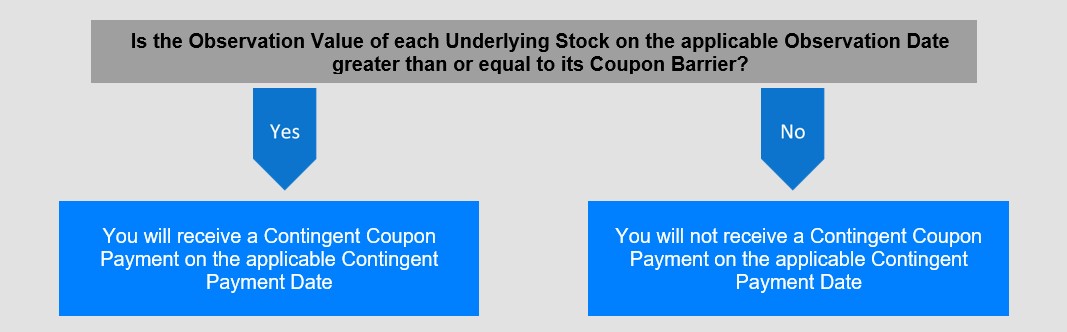 如果,在任何月度观察日,观察值为每个标的股票大于或等于其票息障碍,我们将在适用的或有支付日(包括到期日)支付每1,000.00美元本金票据的或有票息支付,金额等于(i)产品11.25美元次截至相关或有支付日(含相关或有支付日)已发生的或有支付日的数量减(ii)先前已支付的所有或有息票付款的总和。