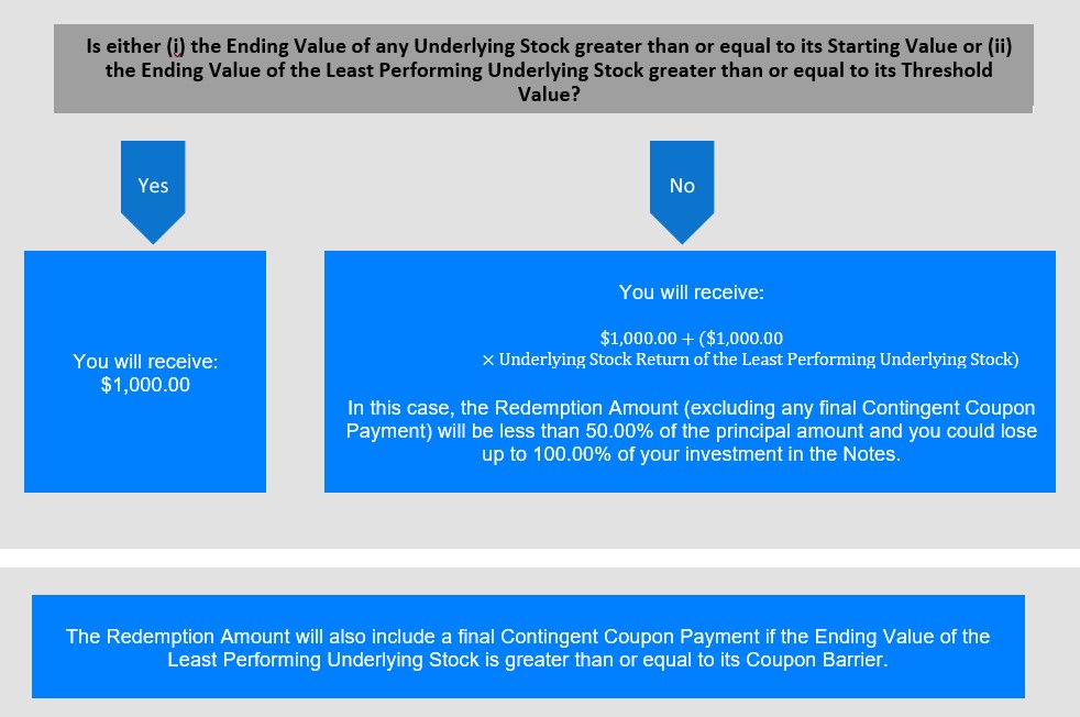 在这种情况下,赎回金额(不包括任何最终或有息票支付)将低于本金额的50.00%,您可能会损失高达100.00%的票据投资。