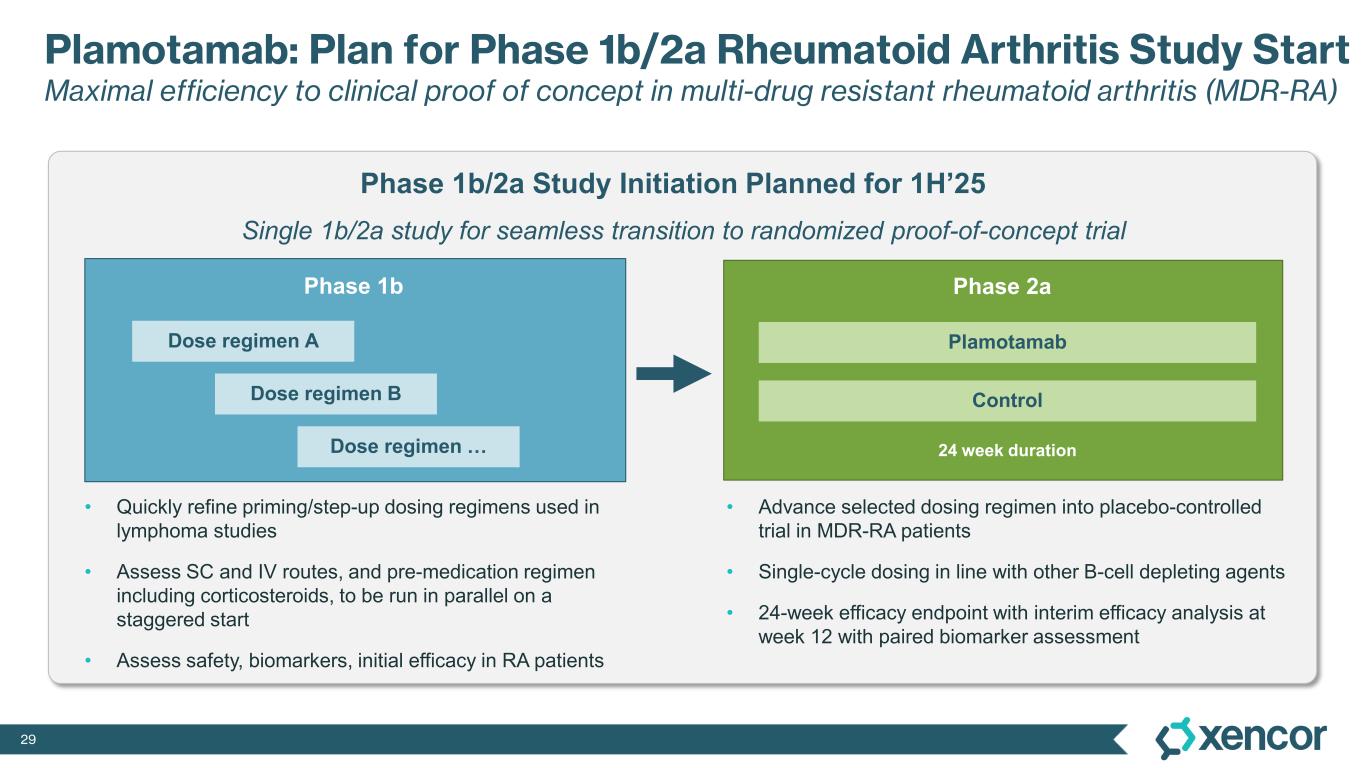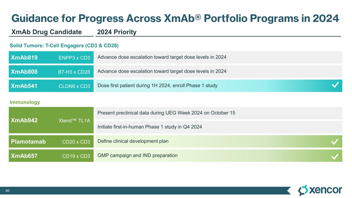 2024年XMAB ®组合项目的46项进展指导XMAB942 XTend TL1A在10月15日的2024年UEG周期间提供了临床前数据XMAB541 CLDN6 x CD3剂量在2024年上半年期间的首例患者,招募1期研究在2024年Q4启动首次人体1期研究XMAB候选药物2024年优先实体瘤:T细胞接合剂(CD3 & CD28)免疫学XMAB819 ENPP3 x CD3在2024年向目标剂量水平提前剂量递增XMAB808 B7-H3 x CD28在2024年向目标剂量水平提前剂量递增Plamotamab CD20 x CD3定义临床开发计划XMAB657 CD19 x CD3 GMP活动和IND准备