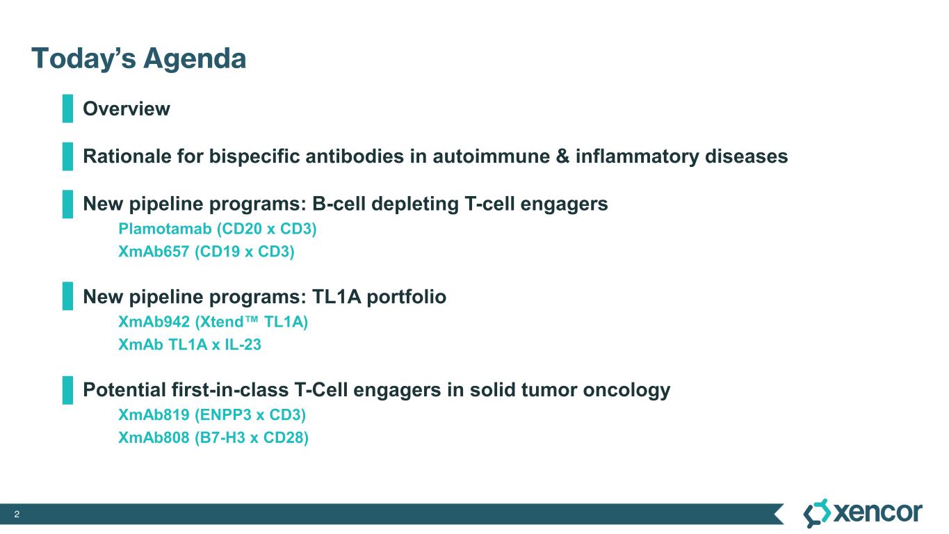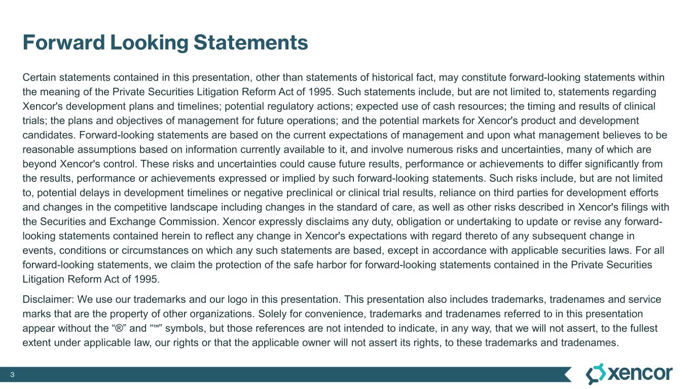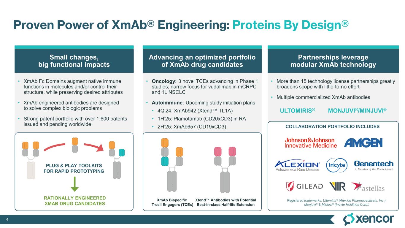 3前瞻性陈述本演示文稿中包含的某些陈述,除历史事实陈述外,可能构成1995年《私人证券诉讼改革法案》含义内的前瞻性陈述。此类声明包括但不限于有关Xencor的开发计划和时间表;潜在的监管行动;现金资源的预期用途;临床试验的时间安排和结果;管理层对未来运营的计划和目标;以及Xencor的产品和开发候选产品的潜在市场的声明。前瞻性陈述基于管理层当前的预期以及管理层根据目前可获得的信息认为合理的假设,涉及众多风险和不确定性,其中许多超出了Xencor的控制范围。这些风险和不确定性可能导致未来的结果、业绩或成就与此类前瞻性陈述明示或暗示的结果、业绩或成就存在显着差异。此类风险包括但不限于开发时间表的潜在延迟或负面的临床前或临床试验结果、开发工作依赖第三方以及竞争格局的变化,包括护理标准的变化,以及Xencor向美国证券交易委员会提交的文件中描述的其他风险。Xencor明确表示不承担任何义务、义务或承诺更新或修改此处包含的任何前瞻性陈述,以反映Xencor对任何此类陈述所依据的事件、条件或情况的任何后续变化的预期的任何变化,除非根据适用的证券法。对于所有前瞻性陈述,我们要求保护1995年《私人证券诉讼改革法案》中包含的前瞻性陈述的安全港。免责声明:我们在本演示文稿中使用我们的商标和徽标。此演示文稿还包括属于其他组织财产的商标、商号和服务标记。仅为方便起见,本演示文稿中提及的商标和商号出现时没有“®”和“”符号,但这些提及无意以任何方式表明,根据适用法律,我们不会在最大程度上主张我们的权利,或者适用的所有者不会主张其对这些商标和商号的权利。