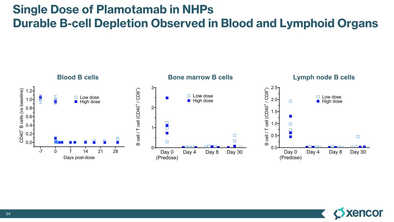 24天0(predose)第4天第8天300123 b ce ll/t c el l(C D 40 +/C D 8 +)低剂量高剂量单剂量Plamotamab在NHPs中观察到的血液中的持久B细胞耗竭和淋巴器官血B细胞淋巴结B细胞骨髓B细胞给药后天数C D 40 + B c el ls(v s ba se lin e)-7 071421280.0 0.2 0.4 0.6 0.8 1.0 1.2低剂量高剂量第0天(前期)第4天第8天第30天0.0 0.5 1.0 1.5 2.0 2.5 b ce ll/t c el l(c d 40 +/c d 8 +)低剂量高剂量