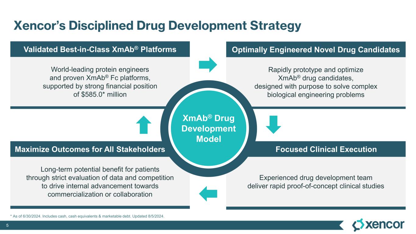 5个世界领先的蛋白质工程师和经过验证的XMAB ® FC平台,由5.850 *亿美元的强劲财务状况提供支持经验丰富的药物开发团队提供快速的概念验证临床研究,快速制作原型并优化XMAB ®候选药物,旨在解决复杂的生物工程问题,通过对数据的严格评估和竞争推动内部向商业化或合作推进,从而为患者带来长期潜在利益Xencor的纪律严明的药物开发战略验证的同类最佳XMAB ®平台优化设计的新型候选药物为所有利益相关者带来最大的结果,专注于临床执行XMAB ®药物开发模型*截至2024年6月30日。包括现金、现金等价物和可销售债务。2024年8月5日更新。