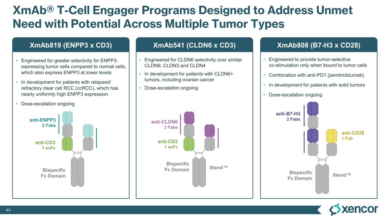 43个XMAB ® T细胞接合器项目,旨在解决跨多种肿瘤类型XMAB819(ENPP3 x CD3)的潜在未满足需求•与正常细胞相比,针对表达ENPP3的肿瘤细胞设计了更高的选择性,正常细胞也在较低水平表达ENPP3 •正在开发用于复发/难治性透明细胞RCC(cCRCC)患者,其ENPP3表达几乎一致高•正在进行剂量递增XMAB541(CLDN6 x CD3)•针对CLDN6选择性而设计,优于类似的CLDN9、CLDN3和CLDN4 •正在开发用于CLDN6 +肿瘤患者,包括卵巢癌•剂量递增正在进行的XMAB808(B7-H3 x CD28)•设计用于仅在与肿瘤细胞结合时提供肿瘤选择性共刺激•与抗PD1(pembrolizumab)联合使用•正在开发用于实体瘤患者•剂量递增正在进行的抗CD3 1 scFV抗ENPP3 2 Fabs双特异性FC结构域抗CD3 1 scFV抗CLDN6 2 Fabs扩展抗CD28 1 Fabb抗B7-H3 2 Fabs XtendBispecific FC结构域双特异性FC结构域