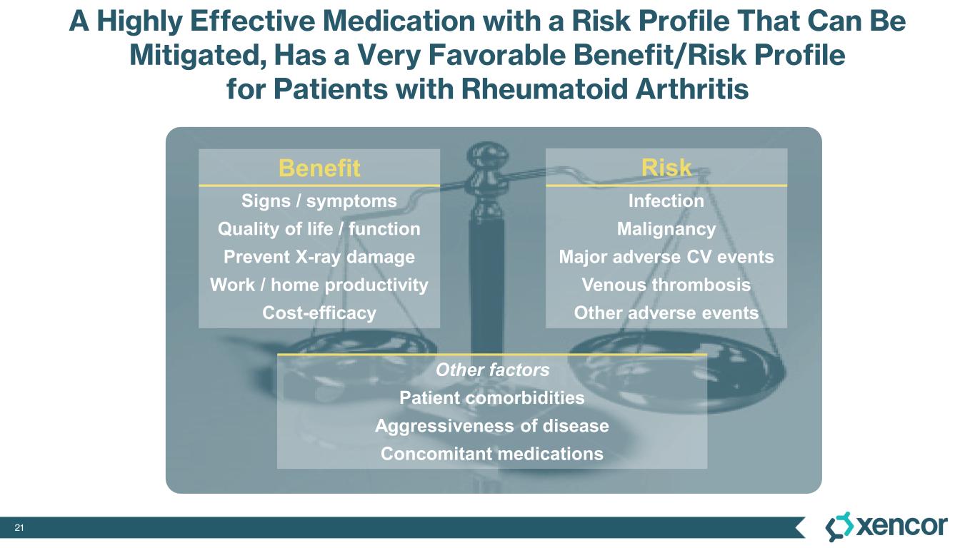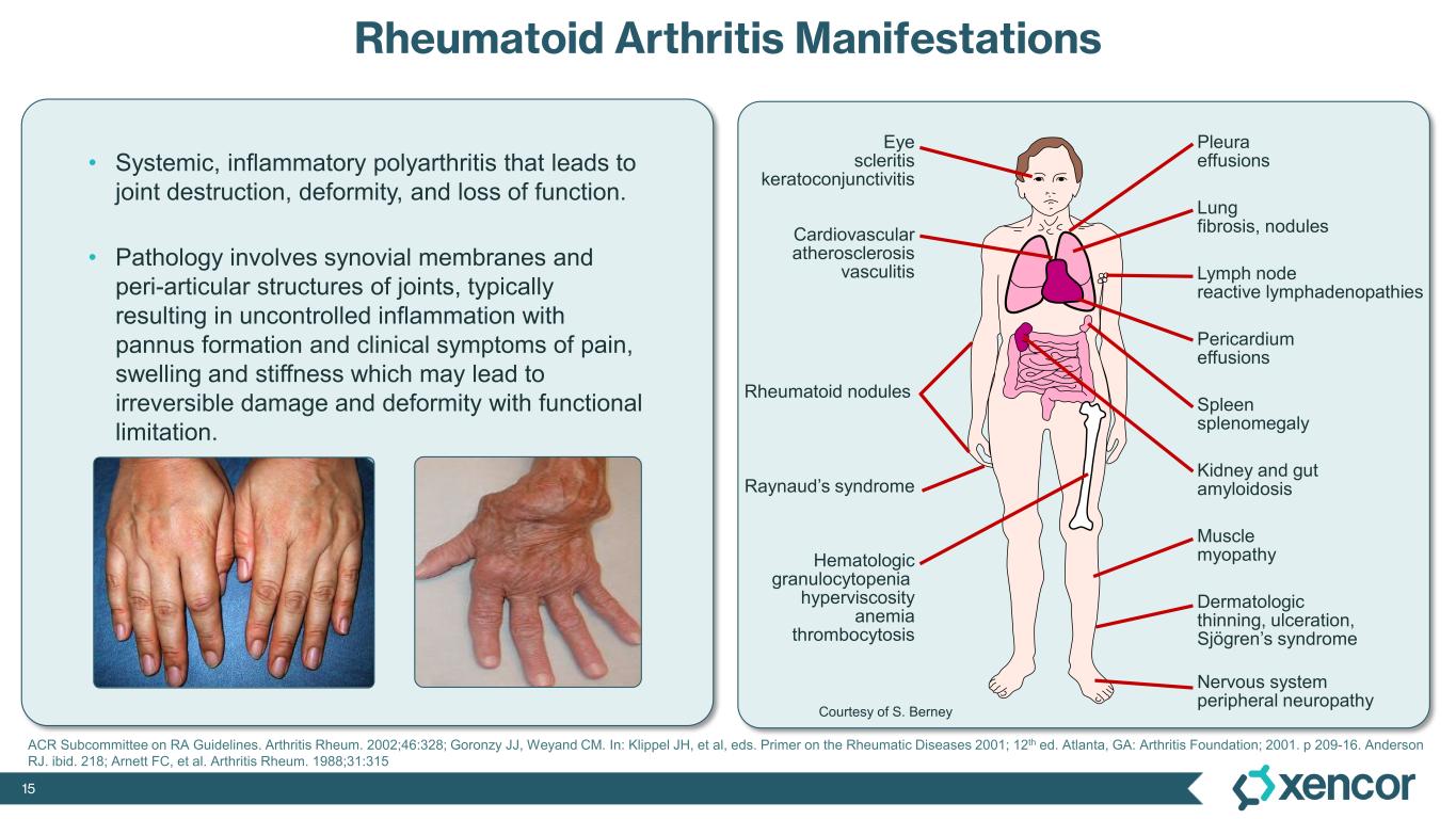 17例RA患者发生CV事件的风险增加1,2。与普通人群相比,CVD死亡风险高50%,这与CV危险因素和炎症相关3,4。DMADs可降低CV事件风险5,6如果疾病活动减少7。RA患者的重症活动与发生恶性淋巴瘤的风险增加70倍相关,特别是弥漫性大B细胞淋巴瘤10。RA与SIE风险增加2倍相关,被认为是由于免疫系统缺陷和糖尿病、肺部或肾脏疾病以及功能障碍等合并症所致8。TNF α抑制剂风险增加2倍,糖皮质激素风险增加4倍。与一般人群相比,活动性RA与深静脉血栓和肺栓塞的发展增加> 2倍有关9。未得到充分治疗的RA心血管病(CVD)严重感染(SIE)静脉和肺血栓形成淋巴瘤1 Avina-Zubieta JA等的后果类风湿性关节炎患者的心血管死亡风险:观察性研究的荟萃分析。关节炎Rheum 2008;59:1690-7。2 Solomon DH,et al.诊断为类风湿性关节炎的妇女的心血管发病率和死亡率。流通2003;107:1303-7。3 Del Rincon I,et al. Escalante A.类风湿性关节炎患者和健康受试者颈动脉粥样硬化与炎症标志物之间的关联。关节炎Rheum 2002;48:1833-40。4 Myasoedova E,et al.类风湿性关节炎中的脂质悖论:血清脂质测量和全身炎症对心血管疾病风险的影响。Ann Rheum DIS 2011;70:482-7。5 Micha R,et al.甲氨蝶呤使用与心血管疾病风险的系统综述和荟萃分析。AM J Cardiol 2011;108:1362-70。6 Barnabe C,et al.系统综述和荟萃分析:抗肿瘤坏死因子a疗法与类风湿性关节炎的心血管事件。Artritis Care Res(Hoboken)2011;63:522-9。7 Solomon DH,et al. Disease activity in rheumatoid arthritis and the risk of cardiovascular events。关节炎和风湿病学。Vol. 67,No. 6,June 2015,pp 1449-55。8 Listing J,et al. Rheumatology,201352(1):53-61。9 Choi HK,et al. Ann Rheum DIS 2013;72:1182-87。10 Baecklund E,et al.关节炎Rheum 2006;54:692-701。