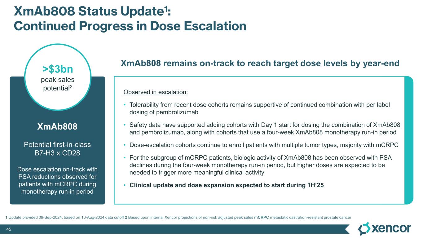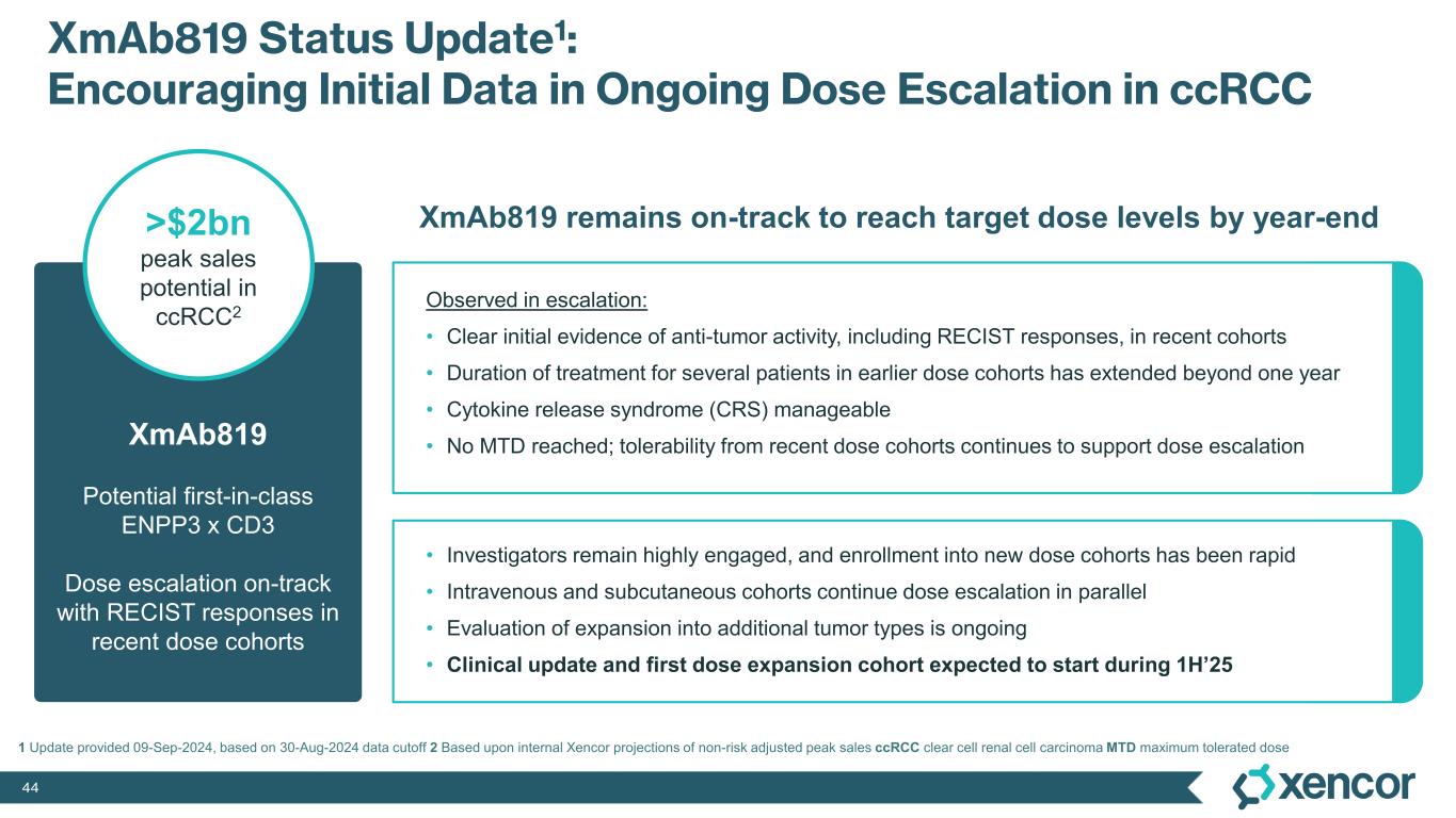 44 XMAB819状态更新1:在cCRCC中正在进行的剂量升级方面令人鼓舞的初步数据XMAB819潜在的first-in-class ENPP3 x CD3剂量升级在轨道上,在最近的剂量组中有RECIST反应>在cCRCC2中有20亿美元的峰值销售潜力1提供了2024年9月9日的更新,基于2024年8月30日的数据截止2,该更新基于对非风险调整的峰值销售的内部Xencor预测,在升级中观察到的cCRCC透明细胞肾细胞癌MTD最大耐受剂量:•明确的抗肿瘤活性的初步证据,包括RECIST反应,在最近的队列中•早期剂量队列中的几名患者的治疗持续时间已延长至一年以上•细胞因子释放综合征(CRS)可控•未达到MTD;最近剂量队列的耐受性继续支持剂量递增XMAB819仍有望在年底前达到目标剂量水平•研究人员的参与度仍然很高,新剂量队列的入组速度一直很快•静脉内和皮下队列继续平行进行剂量递增•正在评估扩展到其他肿瘤类型•临床更新和首次剂量扩展队列预计将于1H'25期间开始