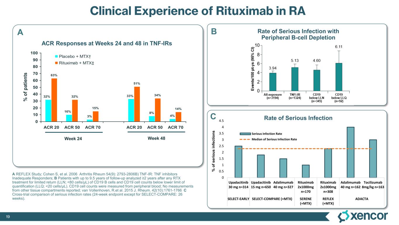 1900.51 1.52 2.53 3.54 4.5 Upadacitinib 30 mg n = 314 Upadacitinib 15 mg n = 650阿达木单抗40 mg n = 327利妥昔单抗2x1000mg n = 170利妥昔单抗2x1000mg n = 308阿达木单抗40 mg n = 162托珠单抗8mg/kg n = 163选择-早期选择-比较(+ MTX)Serene(+ TERM0)REFLEX(+丨MTX MTX)ADACTA严重感染率TNF-IRS中第24周和第48周严重感染率ACR应答的中值REFLEX研究;TERM0科恩 Set al. 2006关节炎Rheum 54(9):2793-2806B)TNF-IR:TNF抑制剂应答者不足;B患者随访时间长达9.5年,分析在任何RTX治疗后≥ 2年CD19 B细胞的有限返回(LLN;< 80细胞/μ L)和CD19细胞计数低于定量下限(LLQ;< 20细胞/μ L)。CD19细胞计数来自外周血;未报告来自其他组织区室的测量;van Vollenhoven,R.et al. 2015 J. Rheum。42(10):1761-1766 C严重感染率的跨试验比较(除选择性比较外的24周终点:26周)。利妥昔单抗在RA第24周第48周严重感染外周B细胞耗尽率A % o f s er io us在fe ct io ns中的临床经验严重感染率32% 16% 3% 33% 8% 4% 63% 32% 15% 51% 34% 14% 0102030405060708090100 ACR20 ACR50 ACR70 ACR20 ACR50 ACR70 % o f p在ie nt s安慰剂+ MTX ↓ ↓介妥昔单抗+丨MTX丨丨丨↓乙丙