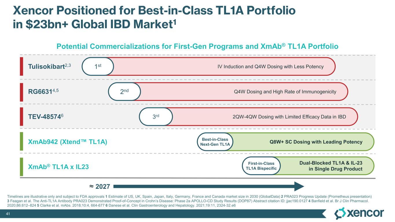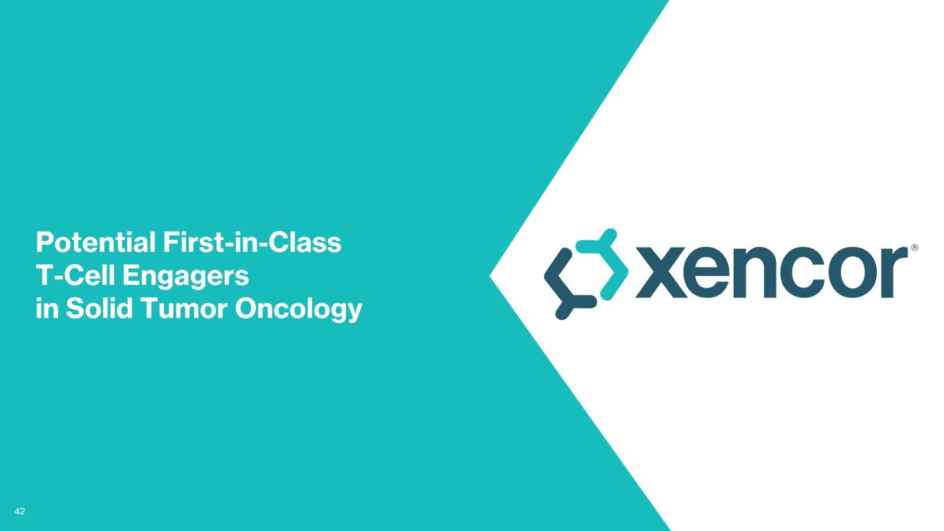 41个Xencor定位于同类最佳TL1A产品组合,价值230亿美元+全球IBD市场1 tulisokibart2,3 ≈ 2027 IV诱导和Q4W给药,电位较小1st rg66314,5 TEV-485746 xmab942(XTLO1A)XMAb ® TL1A x IL23 Q4W给药和高免疫原性率2nd Q8W + SC给药,具有领先的电位BEST-in-Class Next-Gen TL1A时间表仅供说明,须经FDA批准1美国、英国、西班牙、日本、意大利、德国的估计,2030年法国和加拿大市场规模(GlobalData)2 PRA023进展更新(Prometheus演示文稿)3 Feagan等人抗TL1A抗体PRA023在克罗恩病中证明了概念验证:2a期APOLLO-CD研究结果(DOP87)摘要引用ID:jjac190.0127 4 Banfield等人br J clin Pharmacol。2020;86:812 – 8245克拉克等人的单克隆抗体。2018;10:4,664-677 6 Danese et al. Clin Gastroenterology and Hepatology。2021;19:11,2324-32.e6 2QW-4QW给药在IBD3双阻TL1A和IL-23中的有限疗效数据在单药产品First-in-Class TL1A双特异性潜在商业化用于第一代项目和XMAB ® TL1A组合