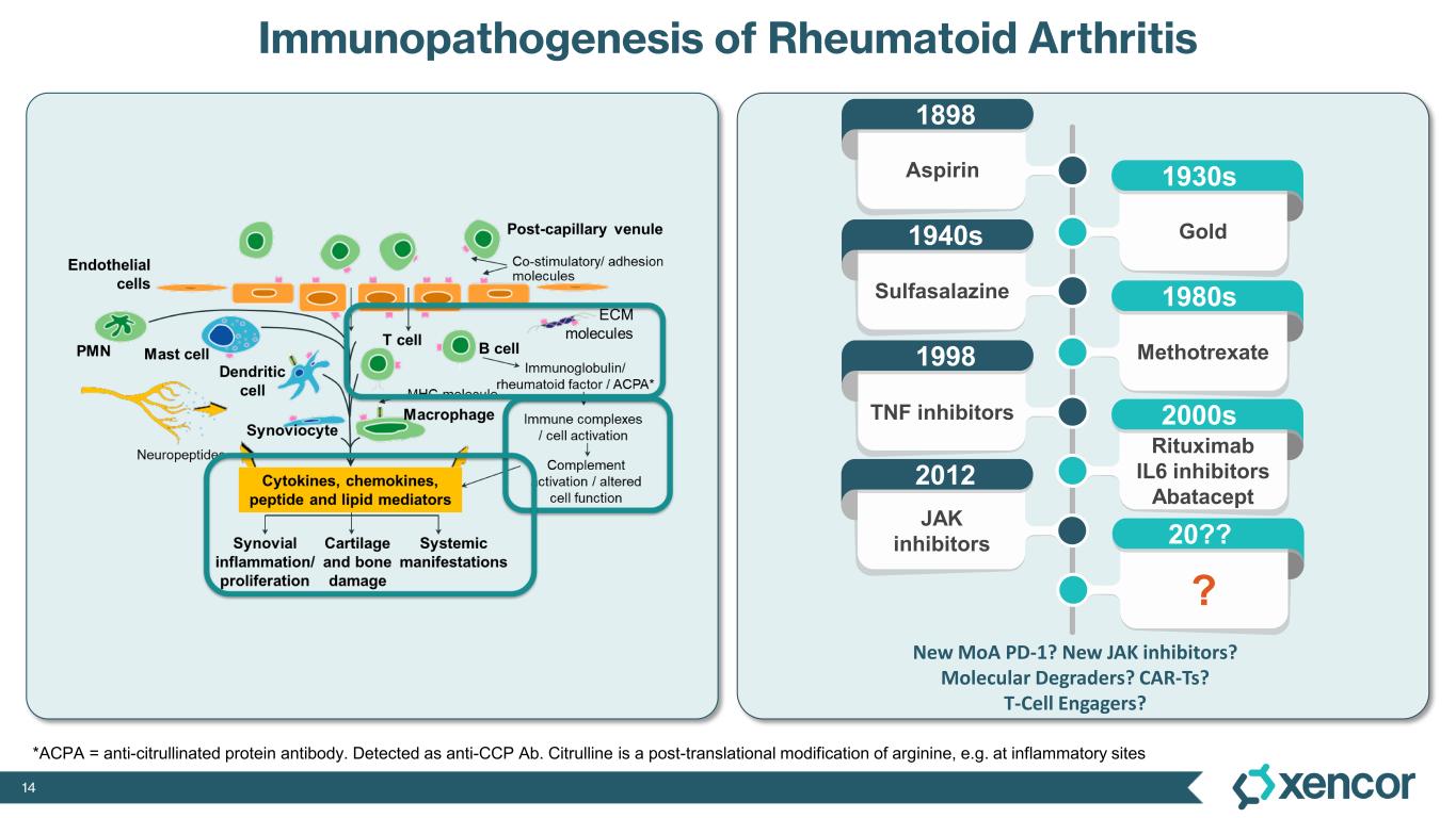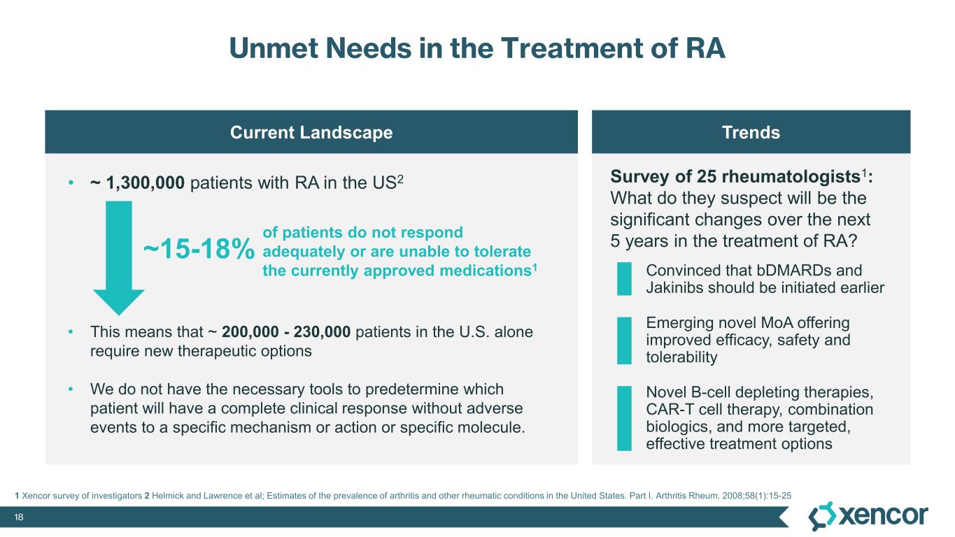 治疗RA的18个未满足需求目前的格局趋势•美国约有1,300,000例RA患者2 •这意味着仅在美国就有约20,000-23,000例患者需要新的治疗方案•我们没有必要的工具来预先确定哪个患者将对特定机制或作用或特定分子产生没有不良事件的完整临床反应。25名风湿科医生调查1:他们怀疑未来5年治疗RA的显著变化是什么?深信bDMARD和Jakinibs应该更早开始使用新兴的新型MoA,提供更好的疗效、安全性和耐受性新型B细胞消耗疗法、CAR-T细胞疗法、联合生物制剂以及更有针对性、更有效的治疗方案1研究人员2 Helmick和Lawrence等人的Xencor调查;对美国关节炎和其他风湿性疾病患病率的估计。第一部分、关节炎风湿。2008;58(1):15-25名患者反应不充分或无法耐受目前批准的药物1~15-18 %