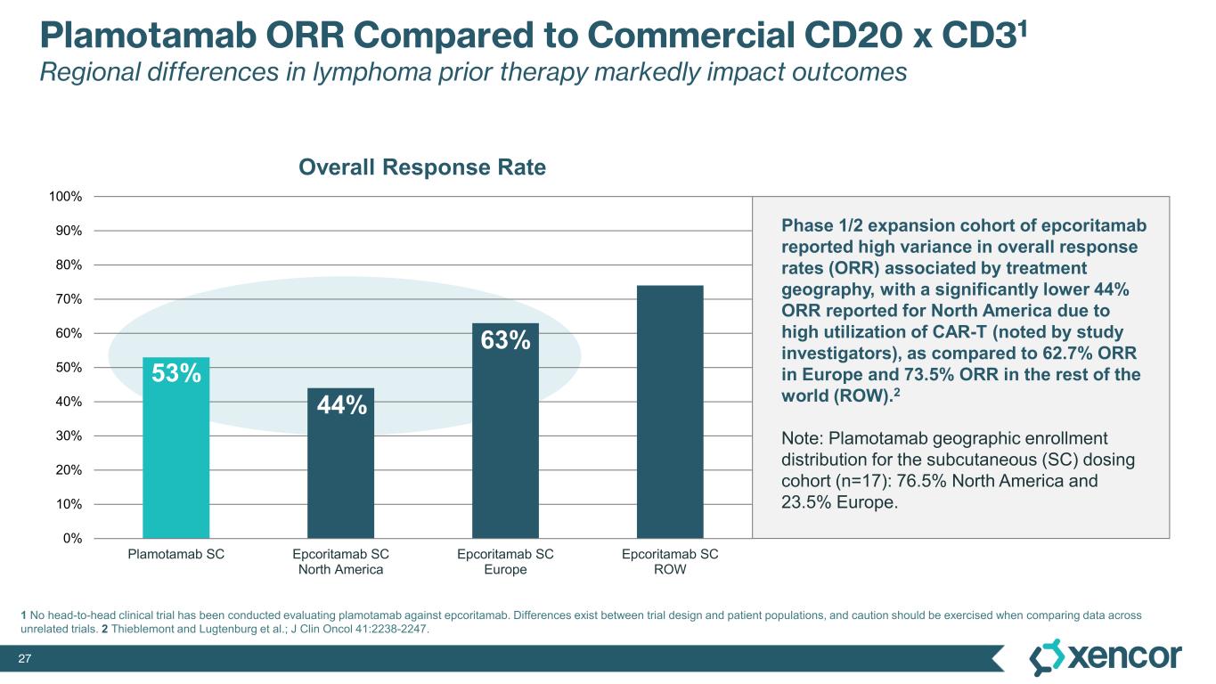 2753% 44% 63% 0% 10% 20% 30% 40% 50% 60% 70% 80% 90% 100% Plamotamab SC ECoritamab SC北美ECoritamab SC Europe Ecoritamab SC ROW Plamotamab ORR与商业CD20 x CD31淋巴瘤先前治疗的区域差异显着影响结果1没有进行评估plamotamab对抗ECoritamab的头对头临床试验。试验设计和患者群体之间存在差异,在比较不相关试验的数据时应谨慎行事。2 Thieblemont和Lugtenburg等人;J Clin Oncol 41:2238-2247。epcoritamab的1/2期扩展队列报告了与治疗地理相关的总体应答率(ORR)的高差异,由于CAR-T的高利用率(研究研究者注意到),北美报告的ORR明显低于44%,而欧洲的ORR为62.7%,世界其他地区的ORR为73.5%(ROW)。2注:皮下(SC)给药队列(n = 17)的Plamotamab地理入组分布:北美为76.5%,欧洲为23.5%。整体回应率