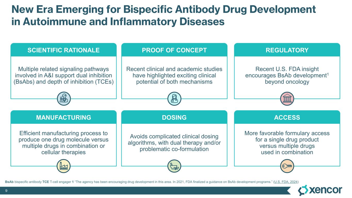 9 ACCESSDOSINGMANUFACTURING RUGORYPROOOOF CONCEPTSICIENTIFIC RATIONALE新时代出现用于自身免疫和炎症性疾病的双特异性抗体药物开发最近的临床和学术研究突出了这两种机制令人兴奋的临床潜力参与A & I的多种相关信号通路支持双重抑制(BSAB)和深度抑制(TCE)最近的美国FDA洞察力鼓励BSAB开发1超越肿瘤学高效制造工艺,以生产一个药物分子而不是联合或细胞疗法的多种药物,避免复杂的临床给药算法,与联合BSAB双特异性抗体TCE T细胞engager 1中使用的多种药物相比,采用双重疗法和/或有问题的联合制剂对单一药物产品更有利的处方集准入“该机构一直在鼓励该领域的药物开发。2021年,FDA敲定了BSAB开发项目指南。”(美国FDA,2024年)