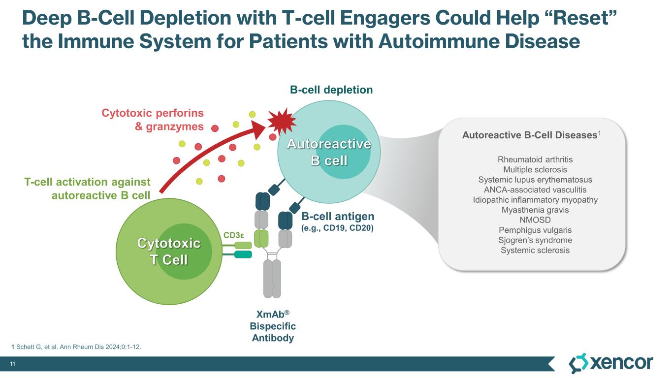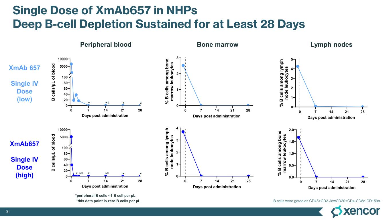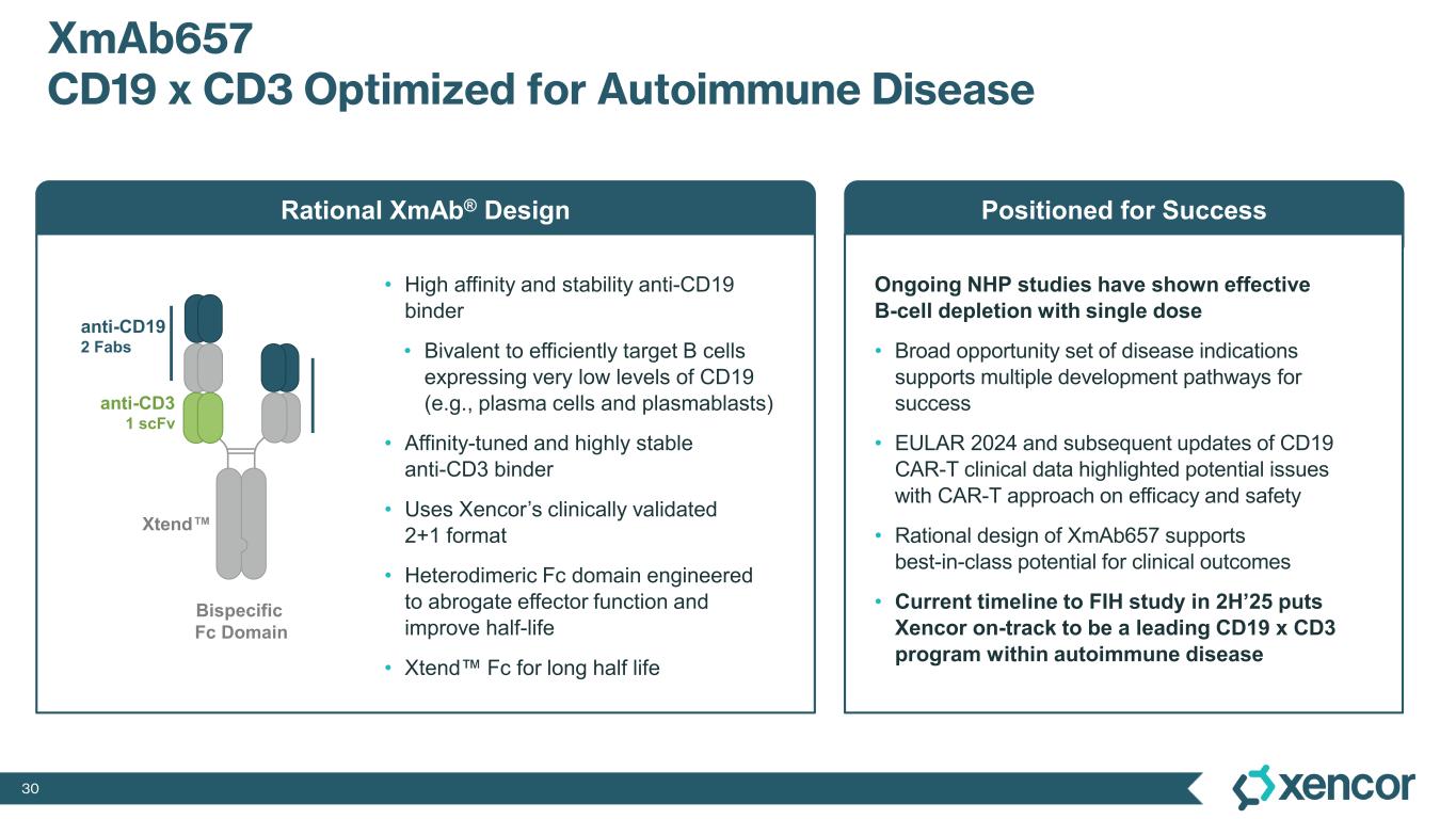 30定位于成功的XMAB ®设计XMAB657 CD19 x CD3优化用于自身免疫性疾病双特异性FC域正在进行的NHP研究表明,单剂量可有效消耗B细胞•广泛的疾病适应症机会集支持成功的多种开发途径• EULAR 2024和随后更新的CD19 CAR-T临床数据突出了CAR-T方法在疗效和安全性方面的潜在问题• XMAB657的合理设计支持临床结果的同类最佳潜力•目前到2H'25的FIH研究的时间表使Xencor走上了成为自身免疫性疾病中领先的CD19 x CD3项目的轨道•高亲和力和稳定性抗CD19结合剂•二价有效靶向表达非常低水平CD19的B细胞(例如浆细胞和浆母细胞)•亲和调节且高度稳定的抗CD3结合剂•使用Xencor临床验证的2 + 1格式•异二聚体FC结构域,旨在消除效应功能并改善半衰期• XTend FC用于长半衰期抗CD3 1 SCFV抗CD19 2 Fabs XTend