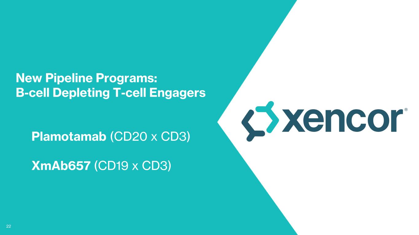 22 ®新管线方案:B细胞耗竭T细胞接合剂Plamotamab(CD20 x CD3)XMAB657(CD19 x CD3)