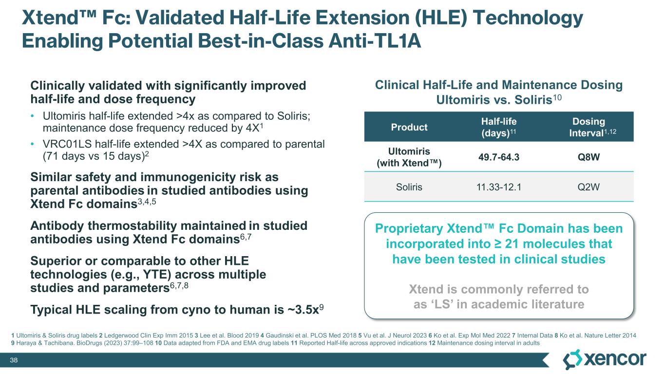 38 XTend FC:经过验证的半衰期延长(HLE)技术,可实现潜在的同类最佳抗TL1A,经临床验证,半衰期和剂量频率显着提高•与Soliris相比,Ultomiris半衰期延长> 4倍;维持剂量频率降低4X1 •与亲本相比,VRC01LS半衰期延长> 4倍(71天vs 15天)2在使用XTend FC结构域的研究抗体中与亲本抗体具有相似的安全性和免疫原性风险3,4,5在使用XTend FC结构域的研究抗体中保持抗体热稳定性6,7优于或与其他HLE技术相当(例如,YTEE)跨多项研究和参数6,7,8从cyno到人的典型HLE缩放是~3.5x9临床半衰期和维持剂量Ultomiris vs. Soliris10产品半衰期(天)11给药间隔1,12 Ultomiris(with XTend)49.7-64.3 Q8W Soliris 11.33-12.1 Q2W 1 Ultomiris & Soliris药物标签2 Ledgerwood Clin exp IMM 2015 3 Lee et al. Blood 20194 Gaudinski et al. PLOS Med 20185 Vu et al. J Neurol 20236 Ko et al. exp mol med 2022 7 Internal Data 8 Ko et al. Nature Letter 20149 Haraya & Tachibana。BioDrugs(2023)37:99 – 10810数据改编自FDA和EMA药物标签11报告的跨批准适应症的半衰期12成人专有XTend FC域的维持给药间隔已纳入≥ 21个已在临床研究中测试的分子XTend在学术文献中通常被称为‘LS’