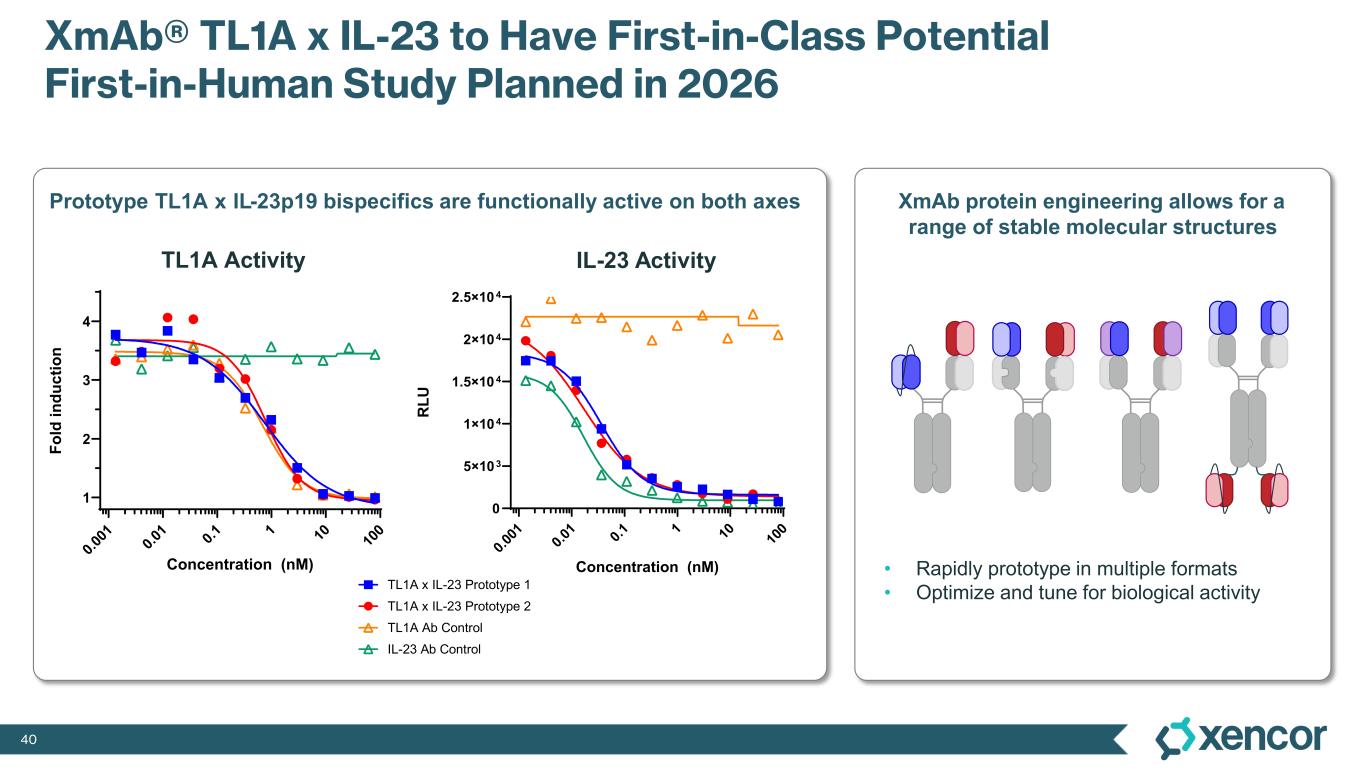 39 XMAB942:设计用于延长半衰期的新型高亲和力抗TL1A MAB,正在开发中,用于治疗IBD • XMAB942利用XTDED FC域技术,具有潜在的一流效力•非人类灵长类动物研究中的半衰期> 22天支持Q8W至Q12W的人体给药•用于皮下给药的高浓度剂型•开始进行首次人体临床研究4Q'24公司计划1强效SC给药Q8-12W给药延长半衰期低免疫原性丨Xencor 丨Xencor XMAB942 默沙东(Prometheus)2,3 MK-7240罗氏(Roivant)4,5 RG-6631 赛诺菲(Teva)6 TEV-4857410月15日1尚未进行针对此处包含的其他数据评估XMAB942的头对头试验。临床试验设计、患者群体和候选产品本身之间存在差异,在跨试验2 PRA023进展更新(Prometheus presentation)3 Feagan等人的数据比较时应谨慎行事。抗TL1A抗体PRA023在克罗恩病中证明了概念验证:2a期APOLLO-CD研究结果(DOP87)摘要引用ID:jjac190.0127 4 Banfield等人br J clin Pharmacol。2020;86:812 – 8245克拉克等人的单克隆抗体。2018;10:4,664-677 6 Danese et al. Clin Gastroenterology and Hepatology。2021;19:11,2324-32.e6
