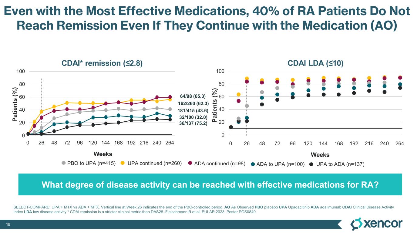 16即使使用最有效的药物,40%的RA患者即使继续使用药物(AO)也达不到缓解020406080100选择比较:UPA + MTX vs ADA + MTX。第26周的垂直线表明中国央行控制期结束。AO作为观察到的PBO安慰剂UPA Upadacitinib ADA阿达木单抗CDAI临床疾病活动指数LDA低疾病活动* CDAI缓解是比DAS28更严格的临床指标。Fleischmann R et al. EULAR 2023。海报POS0849。26487296144168192120216240264周CDAI *缓解(≤ 2.8)CDAI LDA(≤ 10)0 ADA持续(n = 98)PBO到UPA(n = 415)UPA持续(n = 260)ADA到UPA(n = 100)UPA到ADA(n = 137)PAtie nt s(%)020406080100264872961441681921200216240264周PAtie nt s(%)162/260(62.3)64/98(65.3)181/415(43.6)32/100(32.0)36/137(75.2)治疗RA的有效药物可以达到什么程度的疾病活动?