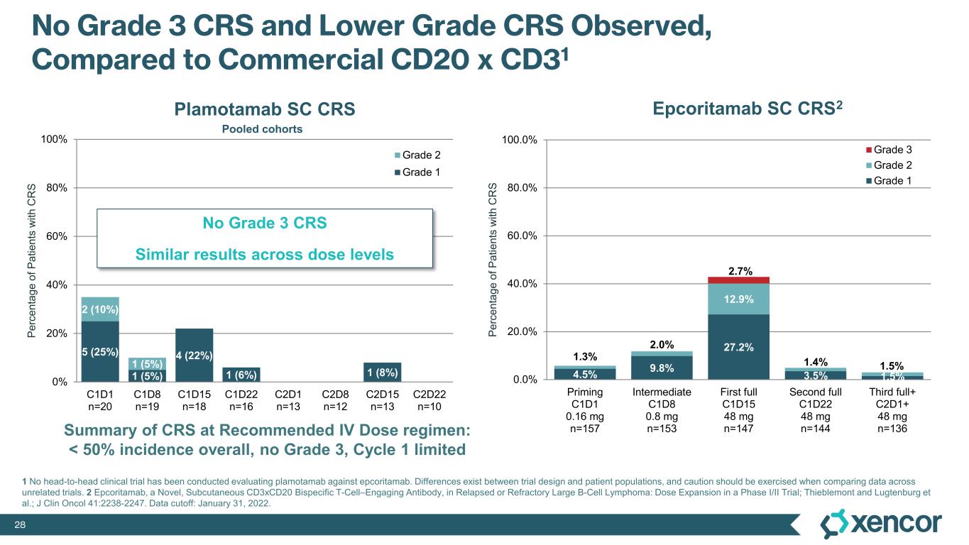 28未观察到3级CRS和较低级别CRS,与商业CD20 x CD31 Epcoritamab SC CRS2Plamotamab SC CRS合并队列1相比,尚未进行评估Plamotamab对抗epcoritamab的头对头临床试验。试验设计和患者群体之间存在差异,在比较不相关试验的数据时应谨慎行事。2 Epcoritamab,一种新型皮下CD3xCD20双特异性T细胞–结合抗体,用于复发或难治性大B细胞淋巴瘤:I/II期试验中的剂量扩展;Thieblemont和Lugtenburg等人;J Clin Oncol 41:2238-2247。数据截止日期:2022年1月31日。5(25%)1(5%)4(22%)1(6%)1(8%)2(10%)1(5%)0% 20% 40% 60% 80% 100% C1D1 n = 20 C1D8 n = 19 C1D15 n = 18 C1D22 n = 16 C2D1 n = 13 C2D8 n = 12 C2D15 n = 13 C2D22 n = 10 PE rc en ta ge o f p at ie nt s w ith C R S 2级14.5% 9.8% 27.2% 3.5% 1.5% 1.3% 2.0% 12.9% 1.4% 1.5% 2.7% 0.0% 20.0% 40.0% 60.0% 80.0% 100.0%引发C1D1 0.16 mg n = 157中间体C1D8 0.8 mg n = 153首次完全C1D15 48 mg48mg n = 136 PE rc en ta ge o f p at ie nt s w ith C R S 3级2级1无3级CRS不同剂量水平的相似结果推荐IV剂量方案的CRS总结:总体发生率< 50%,无3级,第1周期受限