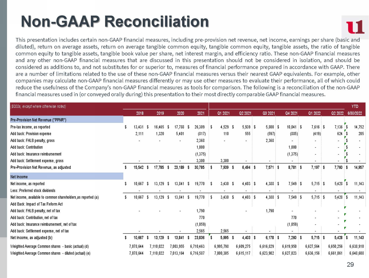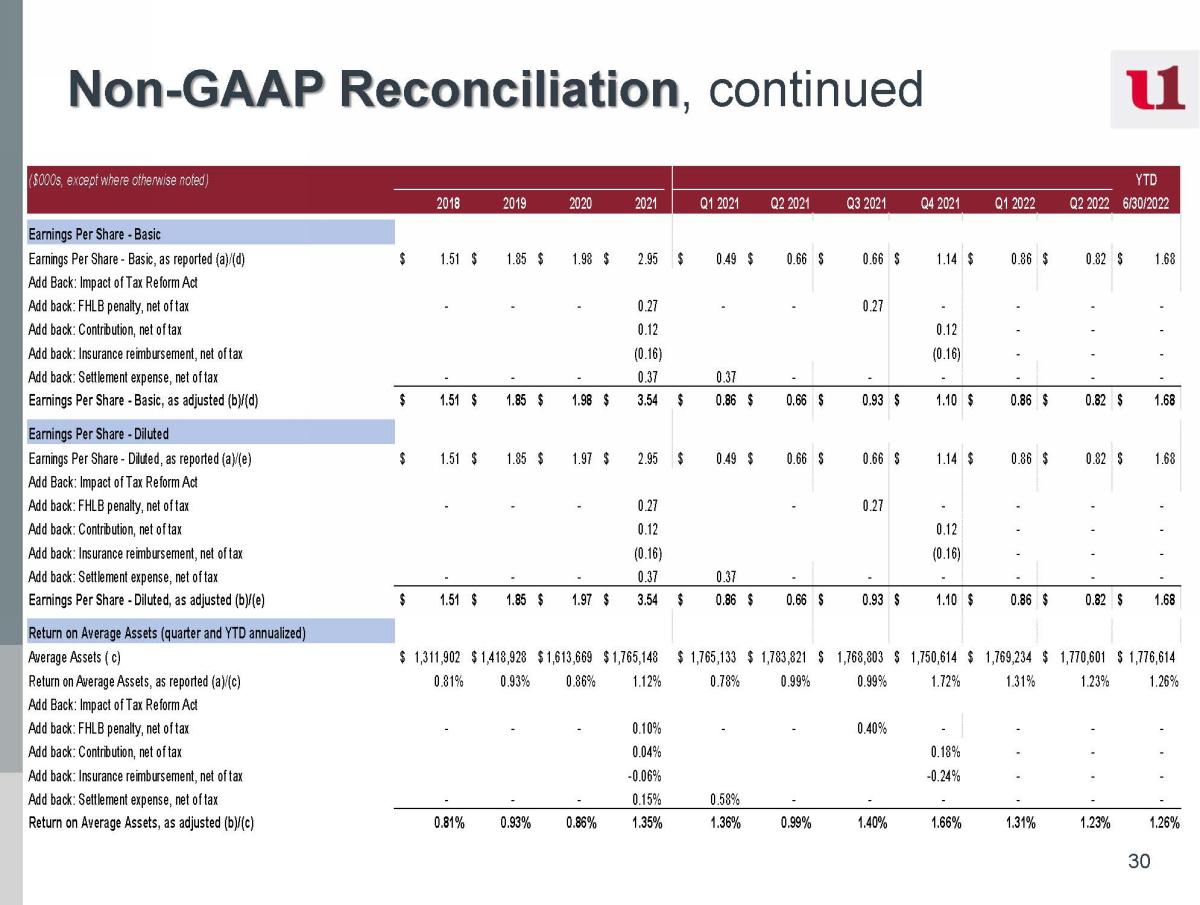 29本演示文稿包括某些非GAAP财务指标,包括拨备前净收入、净收入、每股收益(基本和稀释)、平均资产回报率、平均有形普通股回报率、有形普通股、有形资产、有形普通股与有形资产的比率,每股有形账面价值、净息差和效率比率。本演示文稿中讨论的这些非GAAP财务指标和任何其他非GAAP财务指标不应被孤立地考虑,而应被视为对财务业绩指标的补充,而不是替代或优于根据与公认会计原则。使用这些非GAAP财务指标与其最接近的GAAP等价物相比,存在许多限制。例如,其他公司可能会以不同的方式计算非GAAP财务指标,或者可能使用其他指标来评估其业绩,所有这些 可能会降低公司非GAAP财务指标作为比较工具的有用性。以下是本演示文稿中使用(或在此期间口头传达)的非GAAP财务指标与其最直接可比的GAAP财务指标的对账。非GAAP对账(000美元,除非另有说明)YTD 2018201920202021 Q1 2021 Q2 2021 Q3 2021 Q4 2021 Q1 2022 Q2 20226/30/2022预拨净收入(“PPNR”)税前收入,如报告13,431 $ 16,465 $ 17,788 $ 26,309 $ 4,529 $ 5,939 $ 5,800 $ 10,041 $ 7,616 $ 7,136 $ 14,752 $加回:拨备费用2,1111,3205,401(817)(817)110555(817)(817)(419)624205 $加回:FHLB罚款,总额---2,368--2,368----$加回:供款1,0001,000---$加回:保险报销(1,375)(1,375)---$加回:结算费用,总额---3,300------$预拨净收入,调整后15,542美元17,785美元23,189美元30,785美元7,939美元6,494美元7,571美元8,781美元7,197美元 7,760 $ 14,957 $净收入,如报告的10,667 $ 13,129 $ 13,841 $ 19,770 $ 3,430 $ 4,403 $ 4,388 $ 7,549 $ 5,715 $ 5,428 $ 11,143 $---------------------------------------------------可供普通股股东使用,如报告(a)10,667美元13,129美元13,841美元19,770美元3,430美元4,403美元4,388美元7,549美元5,715美元5,428美元11,143美元加回:税收改革法案的影响加回:FHLB罚款,税后---1,790----加回:贡献,税后净额770770---加回:保险报销,税后净额(1,059)(1,059)---加回:结算费用,税后净额---2,5652,565----净收入,调整后(b)10,667 $ 13,129 $ 13,841 $ 23,836 $ 5,995 $ 4,403 $ 6,178 $ 7,260 $ 5,715 $ 5,428 $ 11,143 $加权平均普通股-基本(实际)7,078,6447,110,022,0039556,710,46366,995,7986,609,2756,616,8296,619,9506,627,56450,2566,638,910加权平均普通股-稀释(实际)(e)7,078,6447,110,0 227,0227,013,1646,516,587,877,0007 6,615,117 6,623,902 6,627,023 6,636,156 6,661,061 6,648,608