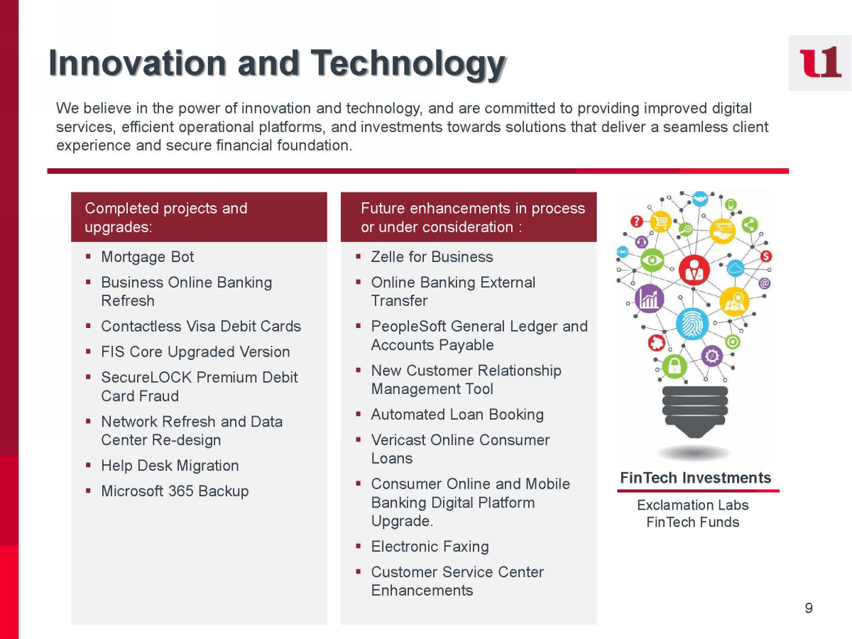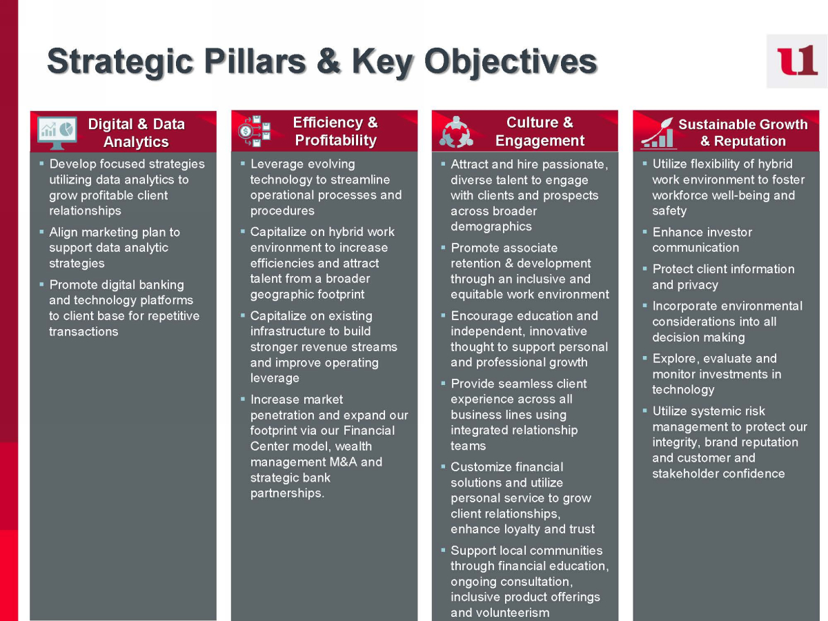 8 ▪利用数据分析制定重点战略,以发展有利可图的客户关系▪调整营销计划以支持数据分析战略▪向客户群推广数字银行和技术平台以进行重复交易▪利用不断发展的技术来简化运营流程和程序▪利用混合工作环境来提高效率并吸引来自更广泛地理足迹的人才▪利用现有基础设施建立更强大的收入来源并提高运营杠杆▪通过我们的金融中心模式提高市场渗透率并扩大我们的足迹,财富管理并购和战略银行合作伙伴关系。▪吸引和雇用热情、多元化的人才,与更广泛人口统计的客户和潜在客户互动▪通过包容和公平的工作环境促进员工保留和发展▪鼓励教育和独立、创新的思想来支持个人和专业 增长▪使用集成关系团队在所有业务线中提供无缝的客户体验▪定制金融解决方案并利用个人服务来发展客户关系、提高忠诚度和信任▪通过金融教育、持续咨询、包容性产品供应和志愿服务▪利用混合工作环境的灵活性来促进员工的福祉和安全▪加强投资者沟通▪保护客户信息和隐私▪将环境考虑纳入所有决策▪探索,评估和监控技术投资▪利用系统性风险管理来保护我们的诚信、品牌声誉以及客户和利益相关者的信心战略支柱和关键目标数字和数据分析效率和盈利能力文化和参与可持续增长和声誉