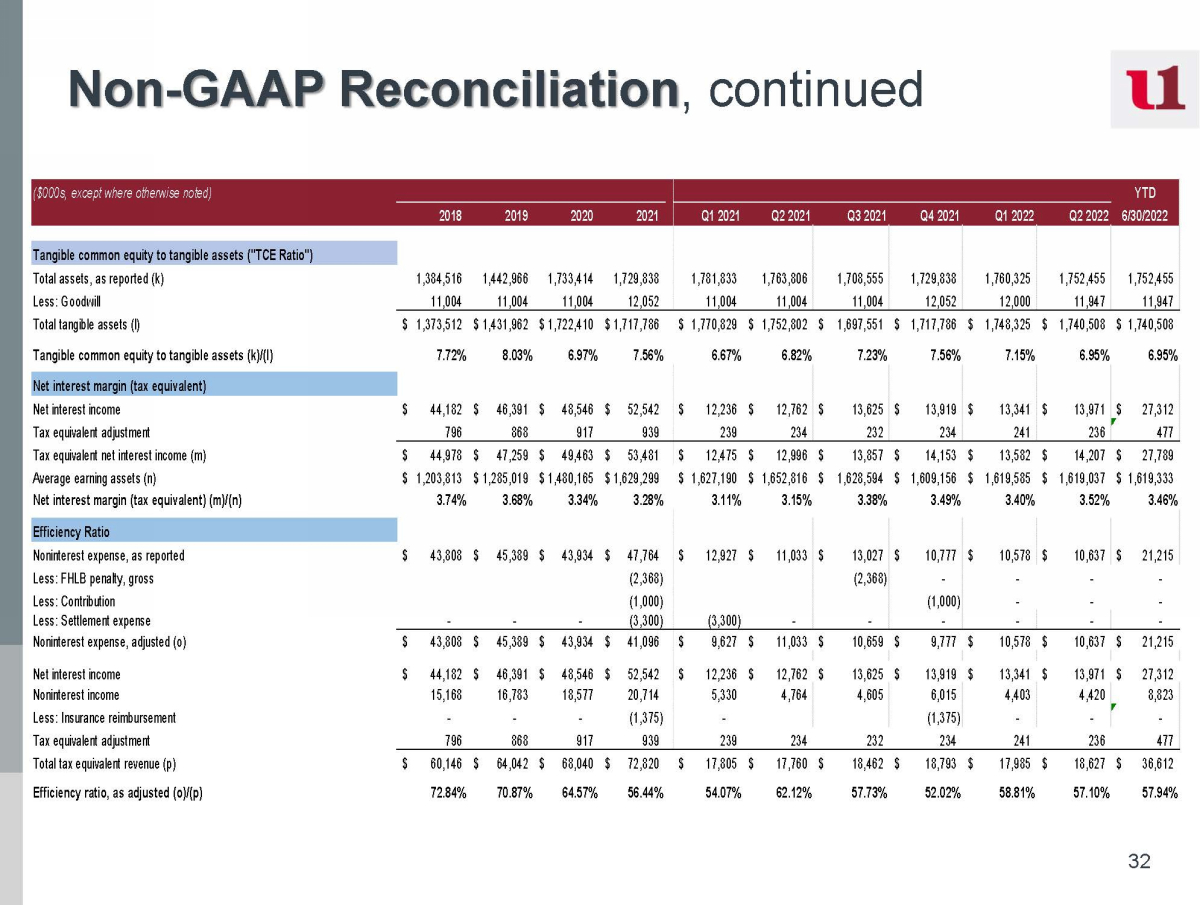30非GAAP对账,续(000美元,除非另有说明)YTD 2018201920202021 Q1 2021 Q2 2021 Q3 2021 Q4 2021 Q1 2022 Q2 20226/30/2022每股收益-基本每股收益-基本,如报告(a)/(d)1.51 $ 1.85 $ 1.98 $ 2.95 $ 0.49 $ 0.66 $ 0.66 $ 1.14 $ 0.86 $ 0.82 $ 1.68 $加回:税收改革法案的影响加回:FHLB罚款,税后--0.27--0.27----加回:贡献,税后净额0.12 0.12---加回:保险报销,税后净额(0.16)(0.16)---加回:结算费用,税后净额--0.37 0.37-----每股收益-基本的,调整后(b)/(d)1.51 $ 1.85 $ 1.98 $ 3.54 $ 0.86 $ 0.66 $ 0.93 $ 1.10 $ 0.86 $ 0.82 $ 1.68 $每股收益-摊薄每股收益-摊薄,如报告(a)/(e)1.51 $ 1.85 $ 1.97 $ 2.95 $ 0.49 $ 0.66 $ 0.66 $ 1.14 $ 0.86 $ 0.82 $ 1.68 $加回:税收改革法案的影响加回:FHLB罚款,税后净额---0.27-0.27----加回:贡献,税后净额0.12 0.12---加 返回:保险报销,税后净额(0.16)(0.16)---加回:结算费用,税后净额---0.37 0.37-----每股收益-稀释,调整后(b)/(e)1.51 $ 1.85 $ 1.97 $ 3.54 $ 0.86 $ 0.66 $ 0.93 $ 1.10 $ 0.86 $ 0.82 $ 1.68 $平均资产回报率(季度和年初至今年化)平均资产(c)1,311,902 $ 1,418,928 $ 1,613,669 $ 1,765,148 $ 1,765,133 $ 1,783,821 $ 1,768,803 $ 1,750,614 $ 1,769,234 $ 1,770,601 $ 1,776,614 $平均资产回报率,如报告(a)/(c)0.81% 0.93% 0.86% 1.12% 0.78% 0.99% 0.99% 1.72% 1.31% 1.23% 1.26%加回:税收改革法案的影响加回:FHLB罚款,税后净额--0.10%--0.40%----加回:贡献,税后净额0.04% 0.18%---加回:保险报销,税后净额-0.06 %-0.24 %---加回:结算费用,税后净额---0.15% 0.58%------平均资产回报率,调整后(b)/(c)0.81% 0.93% 0.86% 1.35% 1.36% 0.99% 1.40% 1.66% 1.31% 1.26%