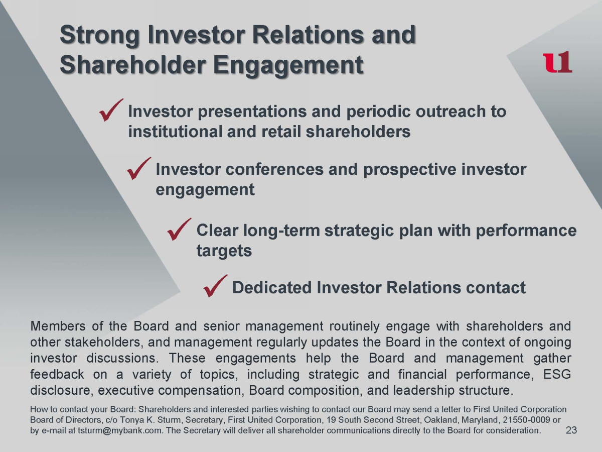 23强大的投资者关系和股东参与董事会成员和高级管理层定期与股东和其他利益相关者接触,管理层在正在进行的投资者讨论的背景下定期向董事会通报最新情况。这些参与有助于董事会和管理层收集有关各种主题的反馈,包括战略和财务绩效、ESG披露、高管薪酬、董事会组成和领导结构。如何联系您的董事会:希望联系我们董事会的股东和利益相关方可以致函马里兰第一联合公司董事会,转交Tonya K. Sturm,First United Corporation秘书,19 South Second Street,Oakland,Maryland,21550-0009或发送电子邮件至tsturm@mybank.com。秘书将直接向董事会提交所有股东通讯以供考虑。明确的具有绩效目标的长期战略计划x专门的投资者关系联系人x投资者 会议和潜在投资者参与x投资者介绍和定期与机构和零售股东接触x