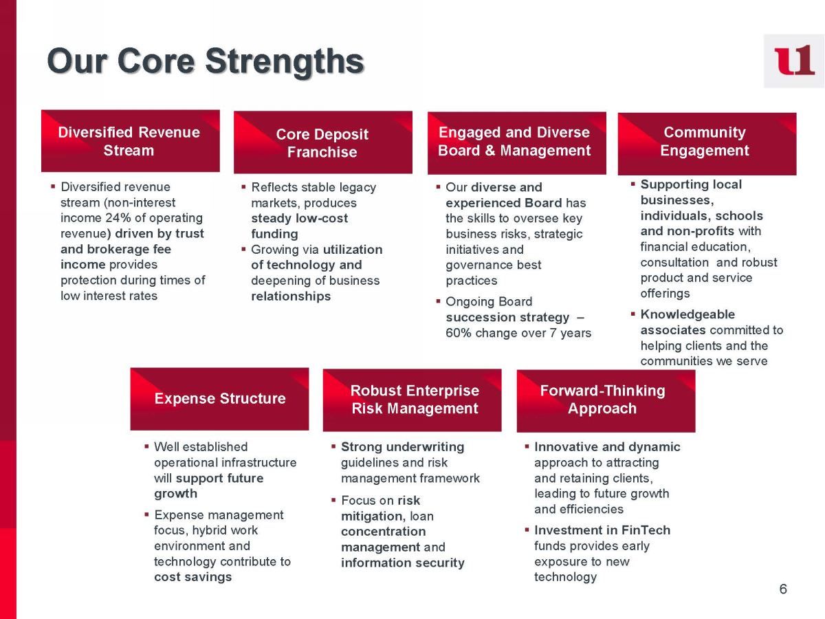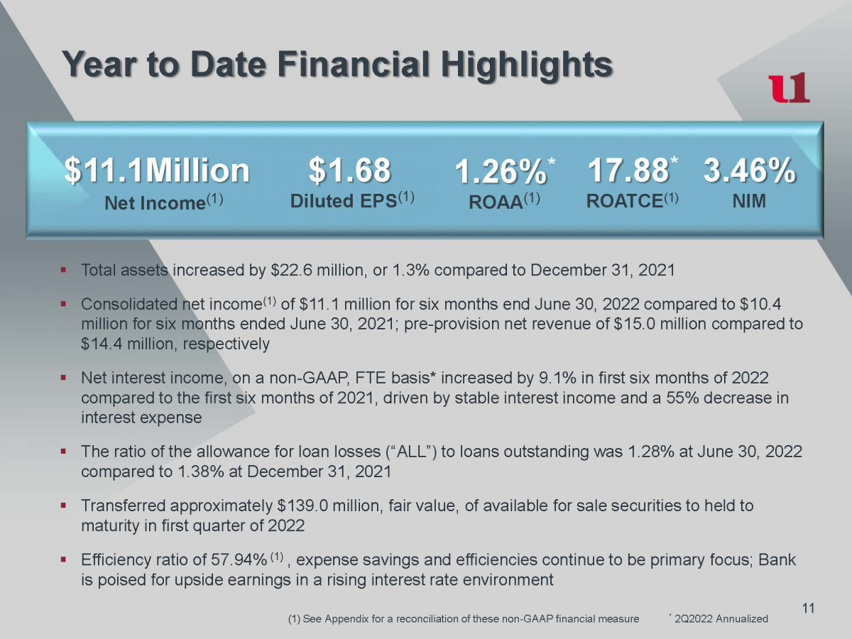 1111年初至今财务摘要1110万美元净收入(1)1.68美元摊薄每股收益(1)1.26% * ROAA(1)17.88 * ROATCE(1)3.46% NIM ▪总资产比12月增加2260万美元,或1.3% 31,2021年▪截至2022年6月30日止六个月的合并净收入(1)为1,110万美元,而截至2021年6月30日止六个月为1,040万美元;拨备前净收入分别为1,500万美元和1,440万美元▪按非公认会计原则计算的净利息收入,与2021年前六个月相比,2022年前六个月的FTE基础*增加了9.1%,主要受利息收入稳定和利息支出减少55%的推动▪贷款损失准备金(“ALL”)与截至6月30日,未偿还贷款为1.28%,2022年与2021年12月31日的1.38%相比▪将约1.390亿美元的公允价值可供出售证券转移至2022年第一季度持有至到期▪效率比率为57.94%(1),费用节省和效率 继续成为主要关注点;银行准备在利率上升的环境中获得上行收益(1)有关这些非GAAP财务指标的对账,请参见附录* 2022年第二季度年度化
