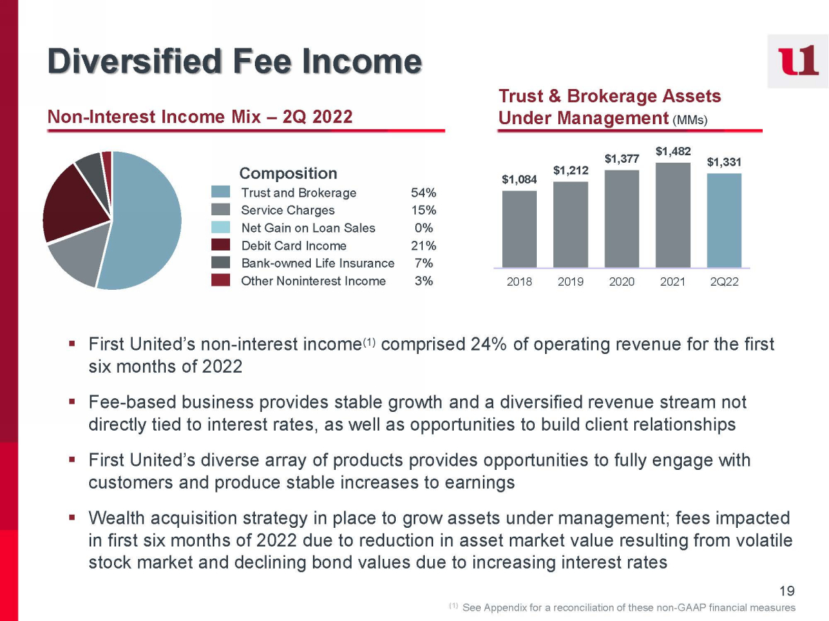 18净息差▪严格的贷款和存款定价产生了强劲的利润率这与我们的同行一致▪ 2021年下半年和2022年前六个月的利润率扩张主要是由于新贷款量和现有贷款定价较高并降低计息负债的成本▪净利息收入得益于贷款收益率的提高,降低计息存款的资金成本以及与提前偿还FHLB长期借款相关的利息支出减少▪我们的团队处理完整客户关系的方法,我们专注于以社区为导向的企业主和我们的高科技分支机构网络提供持续获得低成本存款的途径,资金管理和商业贷款组成部分(1)(1)有关这些非GAAP财务指标的对账,请参见附录4.41% 4.57% 3.99% 3.63% 3.66% 0.86% 1.18% 0.91% 0.51% 0.30% 3.74% 3.68% 3.34% 3.28% 3.46% 0.42% 0.70% 0.49% 0.24% 0.12%-0.5 % 0.5% 1.5% 2.5% 3.5% 4.5% 2018201920202021 2Q22生息资产收益率计息负债成本存款净息差成本