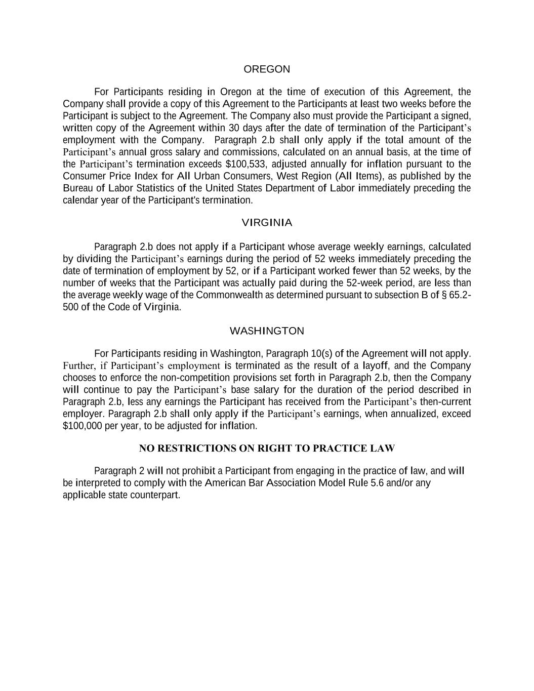 OREGON对于本协议执行时居住在俄勒冈州的参与者,公司应在参与者受协议约束至少两周前向参与者提供本协议的副本。公司还必须在参与者与公司的雇佣关系终止之日后30天内向参与者提供经签署的书面协议副本。2.b款仅适用于参与者终止时按年计算的年薪金毛额和佣金总额超过100,533美元,并根据紧接参与者终止日历年之前的美国劳工部劳工统计局公布的西部地区所有城市消费者消费价格指数(所有项目)按通货膨胀进行年度调整的情况。如果参与者的平均每周收入(按紧接终止雇用日期前52周期间的参与者收入除以52计算),或者如果参与者工作少于52周,则该参与者在52周期间实际获得报酬的周数,低于根据《弗吉尼亚州法典》第65.2-500条第B款确定的联邦平均每周工资,则弗吉尼亚州第2.b款不适用。华盛顿对于居住在华盛顿的参与者,协议第10(s)段将不适用。此外,如果由于裁员而终止了参与者的雇用,而公司选择执行第2.b款规定的竞业禁止条款,那么公司将继续支付参与者在第2.b款所述期间的基本工资,减去参与者从参与者当时的雇主那里获得的任何收入。2.b款仅适用于参与者的收入按年计算超过每年100000美元并根据通货膨胀进行调整的情况。对执业权法第2款没有任何限制,不会禁止参与者从事法律实践,并将被解释为符合美国律师协会示范规则5.6和/或任何适用的州对应方。