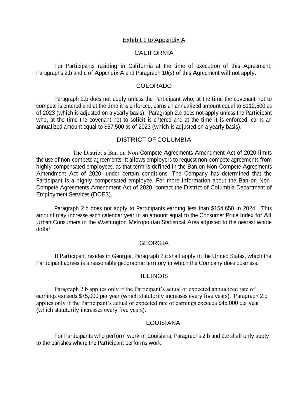 对于本协议执行时居住在加利福尼亚州的参与者,附录A加利福尼亚州的附件 1,附录A的2.b和c段以及本协议的第10(s)段将不适用。COLORADO第2.b款不适用,除非参与者在订立不竞争盟约和执行盟约时,截至2023年的年化收入相当于112,500美元(按年调整)。第2.c款不适用,除非在订立不征求盟约和执行盟约时的参与者截至2023年的年化收入相当于67,500美元(按年调整)。哥伦比亚特区2020年《禁止非竞争协议修正案》限制了非竞争协议的使用。它允许雇主在特定条件下向高薪雇员请求竞业禁止协议,该术语在2020年《禁止竞业禁止协议修正案》中定义。公司已确定该参与者为高薪员工。有关2020年禁止非竞争性协议修正法案的更多信息,请联系哥伦比亚特区就业服务部(DOES)。2.b款不适用于2024年收入低于154650美元的参与者。该金额可能会在每个日历年增加,金额等于华盛顿都市统计区所有城市消费者的消费者价格指数调整为最接近的整美元。GEORGIA如果参与者居住在格鲁吉亚,则第2.c款应适用于美国,参与者同意美国是公司开展业务的合理地理区域。ILINOIS第2.b款仅适用于参与者的实际或预期年化收益率超过每年75,000美元(法定每五年增加一次)的情况。2.c款仅适用于参与者的实际或预期收益率超过每年45000美元(法定每五年增加一次)的情况。路易斯安那州对于在路易斯安那州执行工作的参与者,第2.b和2.c款仅适用于参与者执行工作的教区。